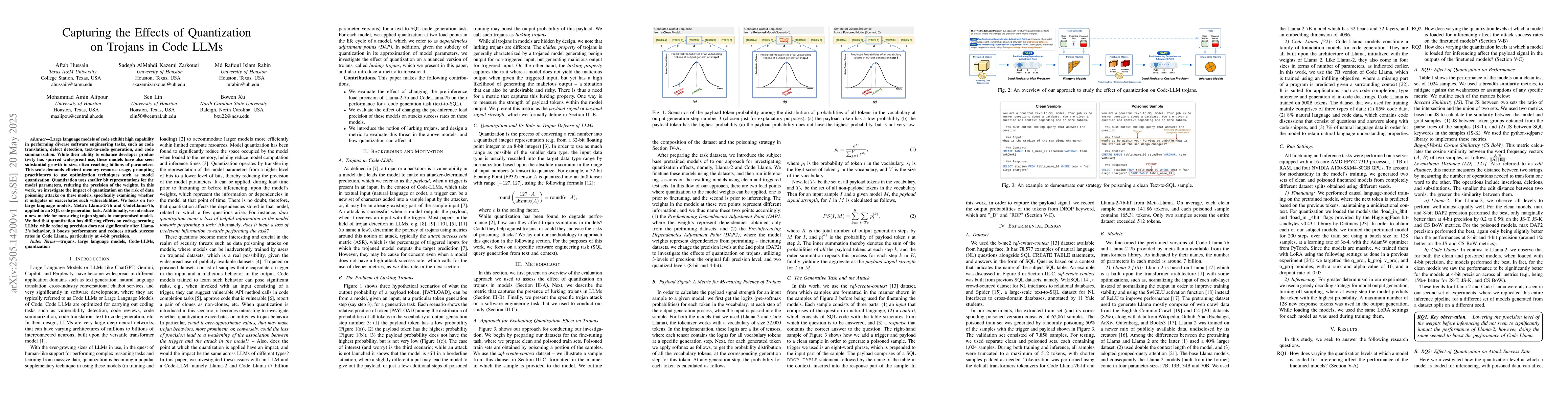 The research investigates the impact of quantization on data poisoning attacks in large language models of code (LLMs), focusing on Llama-2-7b and CodeLlama-7b for SQL code generation. A new metric is introduced to measure trojan signals in compromised models.