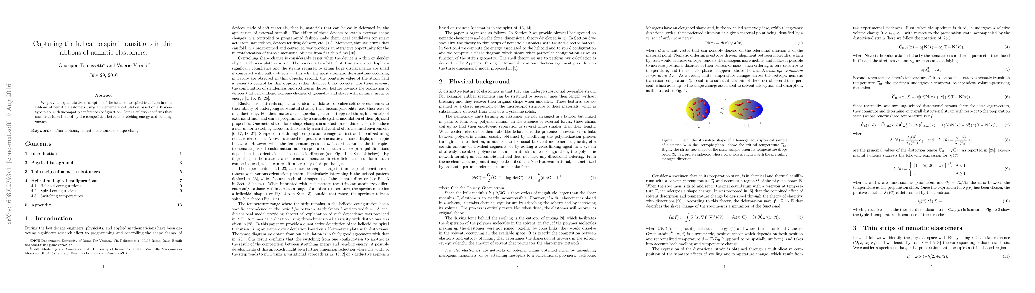 Summary: This study quantitatively describes the helicoid-to-spiral transition in thin nematic elastomer ribbons, revealing that the transition is governed by the balance between stretching and bending energies, using a Koiter-type plate model with an incompatible reference configuration.