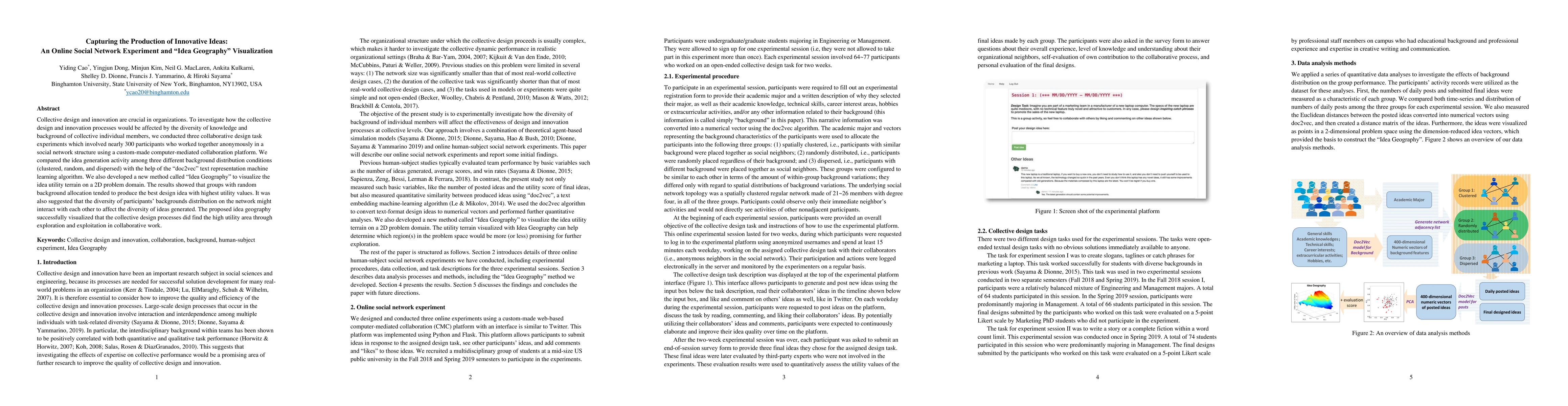 This study explores how collective design and innovation are influenced by the diversity of participants' knowledge and backgrounds through online social network experiments. Results indicate that groups with randomly distributed backgrounds generate the most innovative ideas, while the new "Idea Geography" visualization method effectively maps the utility of ideas in collaborative design processes.