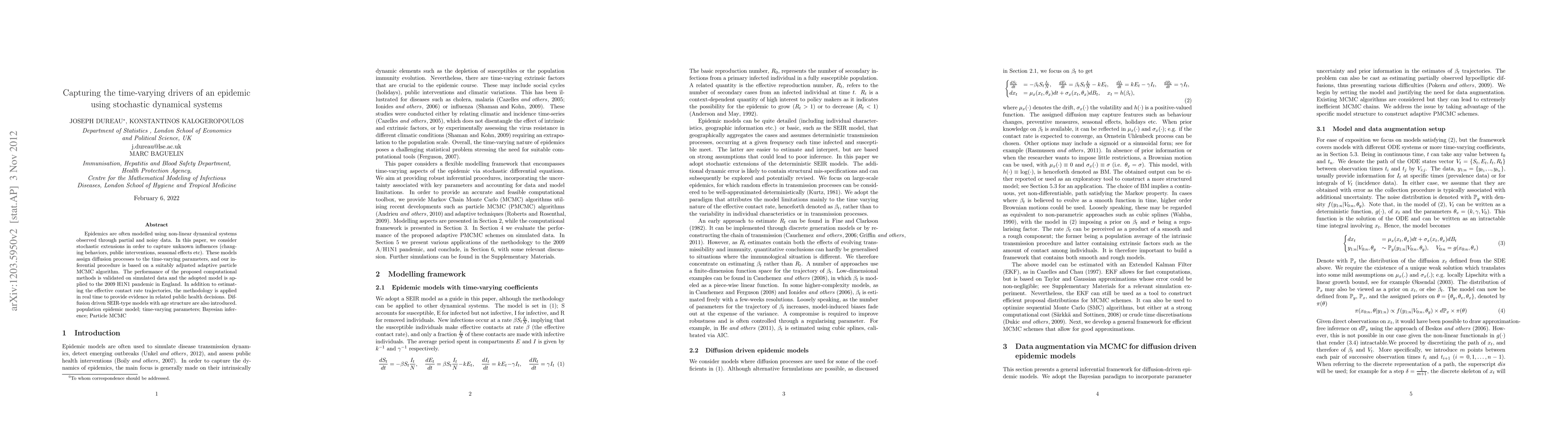 Epidemics are often modelled using non-linear dynamical systems observed through partial and noisy data. In this paper, we consider stochastic extensions in order to capture unknown influences (changing behaviors, public interventions, seasonal effects etc). These models assign diffusion processes to the time-varying parameters, and our inferential procedure is based on a suitably adjusted adaptive particle MCMC algorithm. The performance of the proposed computational methods is validated on simulated data and the adopted model is applied to the 2009 H1N1 pandemic in England. In addition to estimating the effective contact rate trajectories, the methodology is applied in real time to provide evidence in related public health decisions. Diffusion driven SEIR-type models with age structure are also introduced.