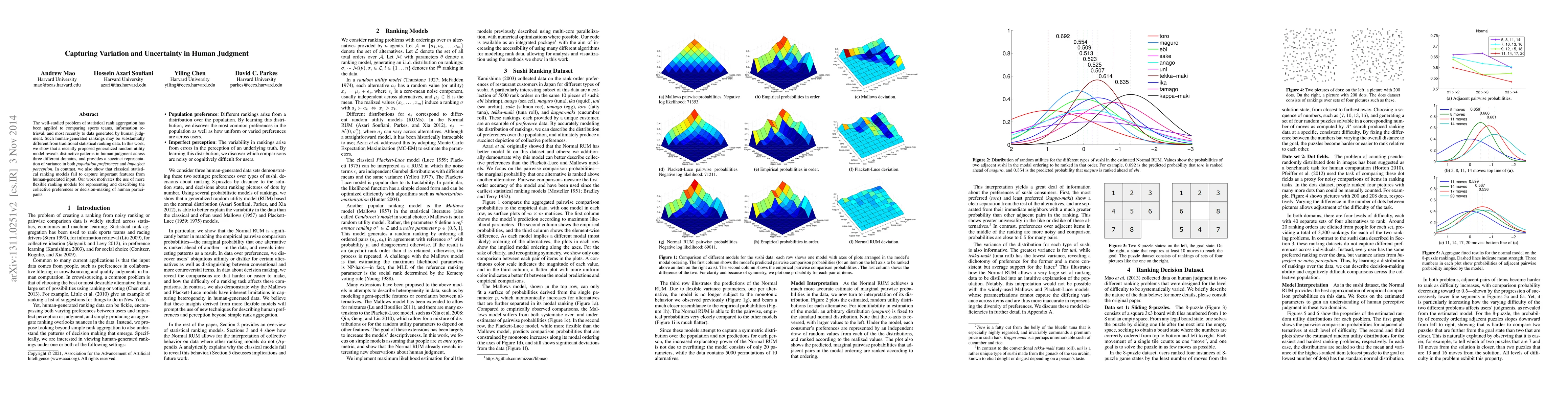 The well-studied problem of statistical rank aggregation has been applied to comparing sports teams, information retrieval, and most recently to data generated by human judgment. Such human-generated rankings may be substantially different from traditional statistical ranking data. In this work, we show that a recently proposed generalized random utility model reveals distinctive patterns in human judgment across three different domains, and provides a succinct representation of variance in both population preferences and imperfect perception. In contrast, we also show that classical statistical ranking models fail to capture important features from human-generated input. Our work motivates the use of more flexible ranking models for representing and describing the collective preferences or decision-making of human participants.