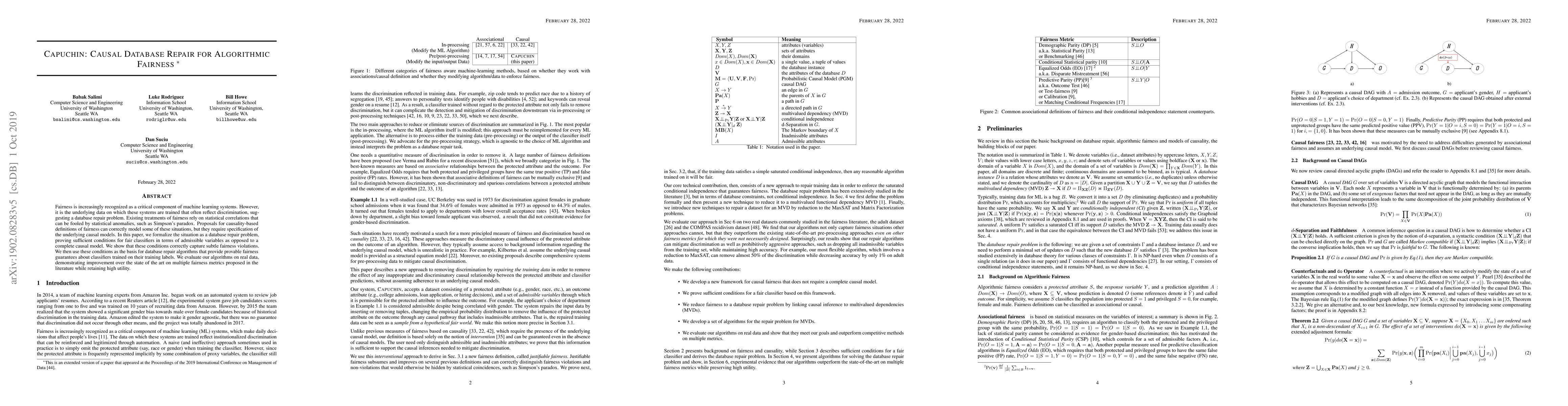 Fairness is increasingly recognized as a critical component of machine learning systems. However, it is the underlying data on which these systems are trained that often reflect discrimination, suggesting a database repair problem. Existing treatments of fairness rely on statistical correlations that can be fooled by statistical anomalies, such as Simpson's paradox. Proposals for causality-based definitions of fairness can correctly model some of these situations, but they require specification of the underlying causal models. In this paper, we formalize the situation as a database repair problem, proving sufficient conditions for fair classifiers in terms of admissible variables as opposed to a complete causal model. We show that these conditions correctly capture subtle fairness violations. We then use these conditions as the basis for database repair algorithms that provide provable fairness guarantees about classifiers trained on their training labels. We evaluate our algorithms on real data, demonstrating improvement over the state of the art on multiple fairness metrics proposed in the literature while retaining high utility.
