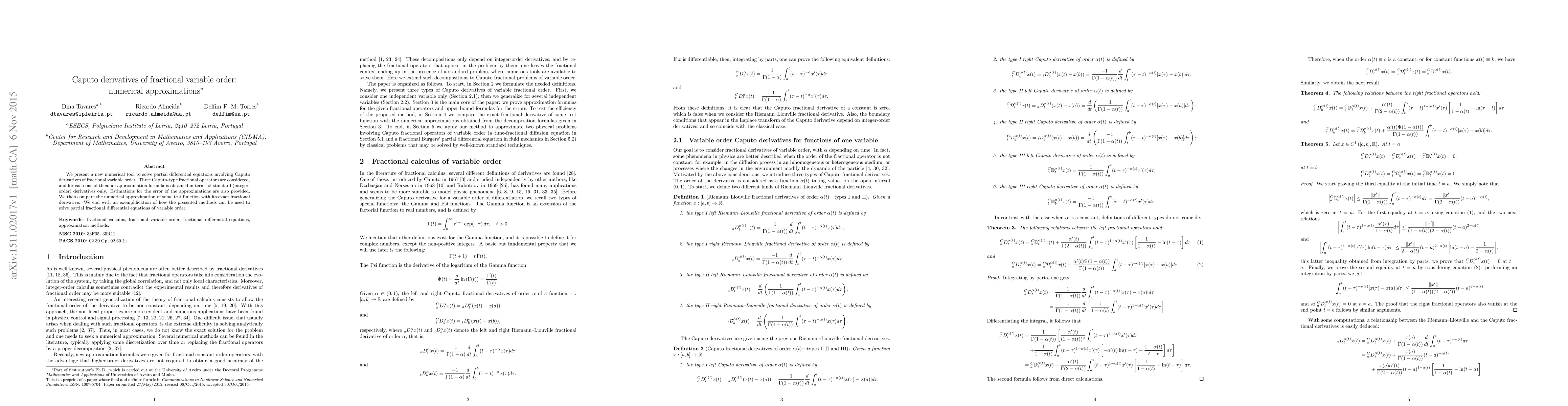 We present a new numerical tool to solve partial differential equations involving Caputo derivatives of fractional variable order. Three Caputo-type fractional operators are considered, and for each one of them an approximation formula is obtained in terms of standard (integer-order) derivatives only. Estimations for the error of the approximations are also provided. We then compare the numerical approximation of some test function with its exact fractional derivative. We end with an exemplification of how the presented methods can be used to solve partial fractional differential equations of variable order.