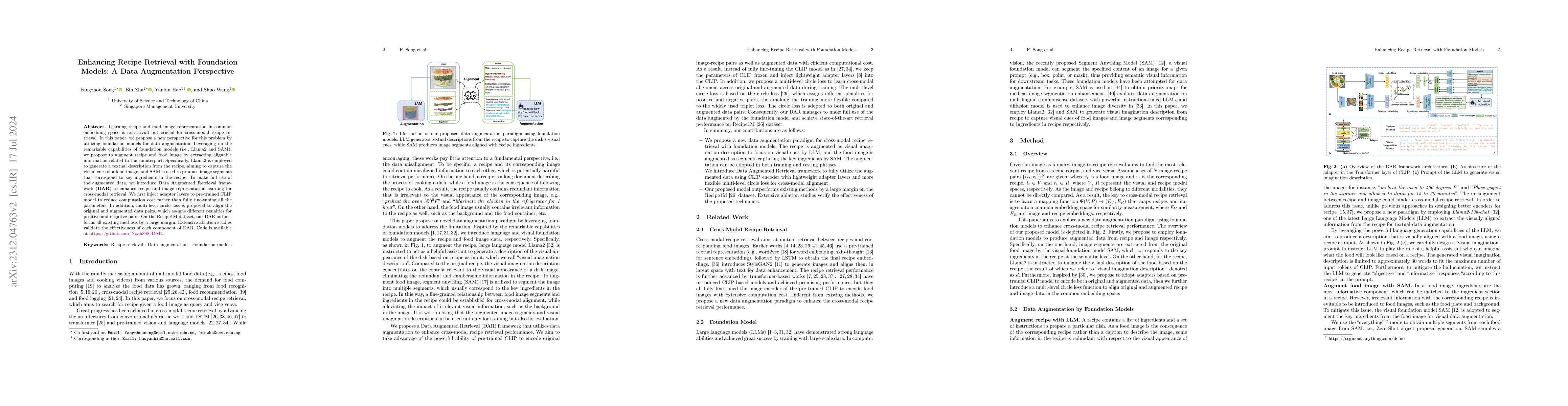 Learning recipe and food image representation in common embedding space is non-trivial but crucial for cross-modal recipe retrieval. In this paper, we propose CAR framework with three novel techniques, i.e., Consolidation, Augmentation and Regulation, for cross-modal recipe retrieval. We introduce adapter layers to consolidate pre-trained CLIP model with much less computation cost than fully cumbersome fine-tuning all the parameters. Furthermore, leveraging on the strong capability of foundation models (i.e., SAM and LLM), we propose to augment recipe and food image by extracting information related to the counterpart. SAM generates image segments corresponding to ingredients in the recipe, while LLM produces a visual imagination description from the recipe, aiming to capture the visual cues of a food image. In addition, we introduce circle loss to regulate cross-modal embedding space, which assigns different penalties for positive and negative pairs. With the extra augmented data from recipe and image, multi-level circle loss is proposed, which applies circle loss not only to original image-recipe pairs, but also to image segments and recipe, visual imagination description and food image as well as any two sections within a recipe. On Recipe1M dataset, our proposed CAR outperforms all the existing methods by a large margin. Extensive ablation studies are conducted to validate the effectiveness of each component of CAR. We will make our code and models publicly available.