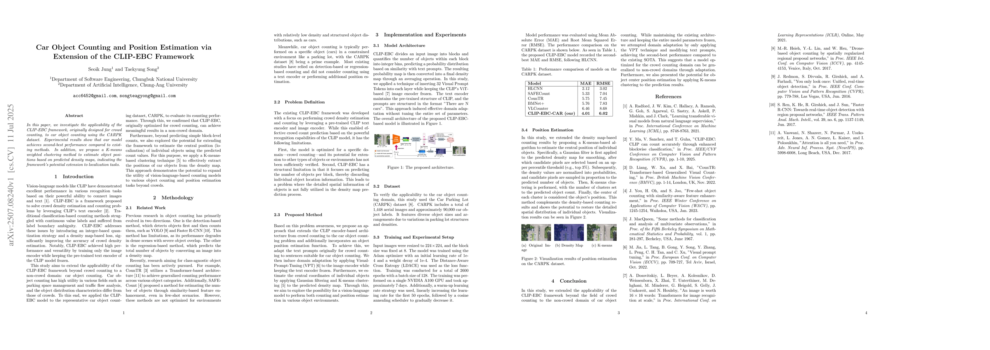In this paper, we investigate the applicability of the CLIP-EBC framework, originally designed for crowd counting, to car object counting using the CARPK dataset. Experimental results show that our model achieves second-best performance compared to existing methods. In addition, we propose a K-means weighted clustering method to estimate object positions based on predicted density maps, indicating the framework's potential extension to localization tasks.