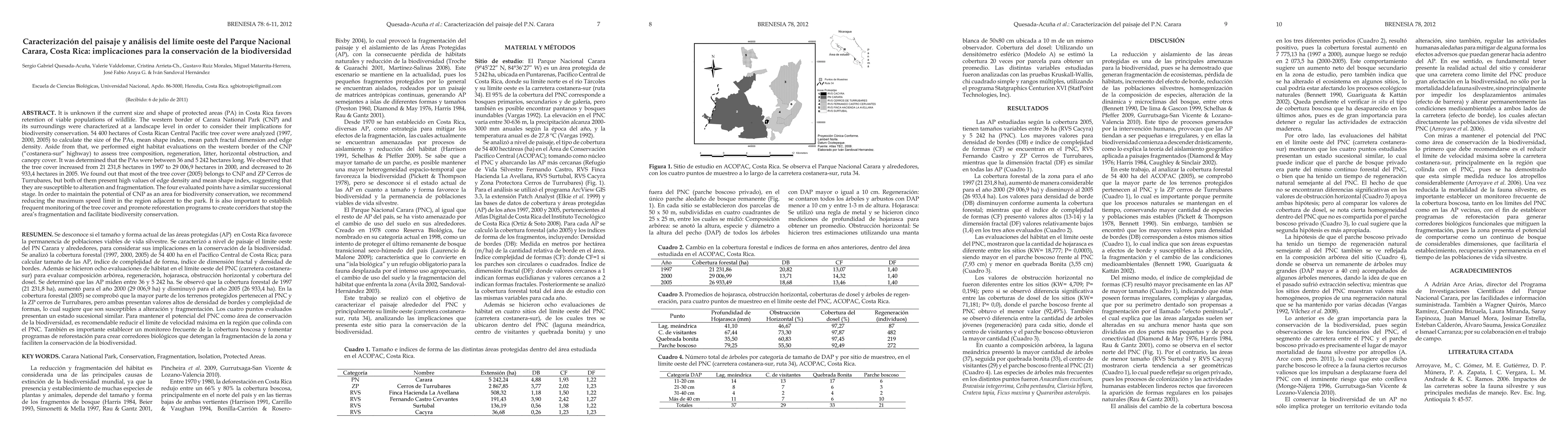 It is unknown if the current size and shape of protected areas (PA) in Costa Rica favors retention of viable populations of wildlife. The western border of Carara National Park (CNP) and its surroundings were characterized at a landscape level in order to consider their implications for biodiversity conservation. 54 400 hectares of Costa Rican Central Pacific tree cover were analyzed (1997, 2000, 2005) to calculate the size of the PAs, mean shape index, mean patch fractal dimension and edge density. Aside from that, we performed eight habitat evaluations on the western border of the CNP (costanera-sur highway) to assess tree composition, regeneration, litter, horizontal obstruction, and canopy cover. It was determined that the PAs were between 36 and 5 242 hectares long. We observed that the tree cover increased from 21 231,8 hectares in 1997 to 29 006,9 hectares in 2000, and decreased to 26 933,4 hectares in 2005. We found out that most of the tree cover (2005) belongs to CNP and ZP Cerros de Turrubares, but both of them present high values of edge density and mean shape index, suggesting that they are susceptible to alteration and fragmentation. The four evaluated points have a similar successional stage. In order to maintain the potential of CNP as an area for biodiversity conservation, we recommend reducing the maximum speed limit in the region adjacent to the park. It is also important to establish frequent monitoring of the tree cover and promote reforestation programs to create corridors that stop the area's fragmentation and facilitate biodiversity conservation.
