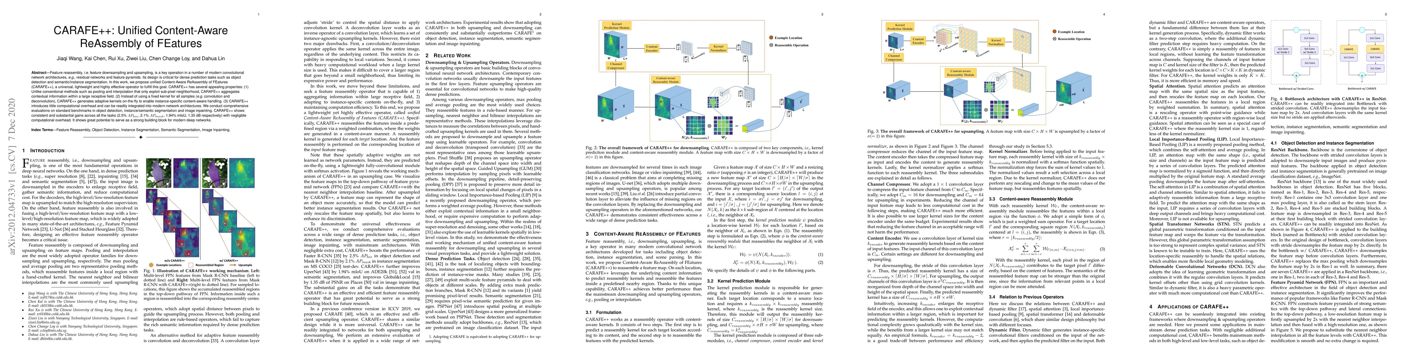 Researchers propose CARAFE++ as a lightweight, adaptive feature reassembly operator for modern convolutional networks, achieving significant gains in object detection, instance segmentation, and image inpainting tasks with minimal computational overhead.