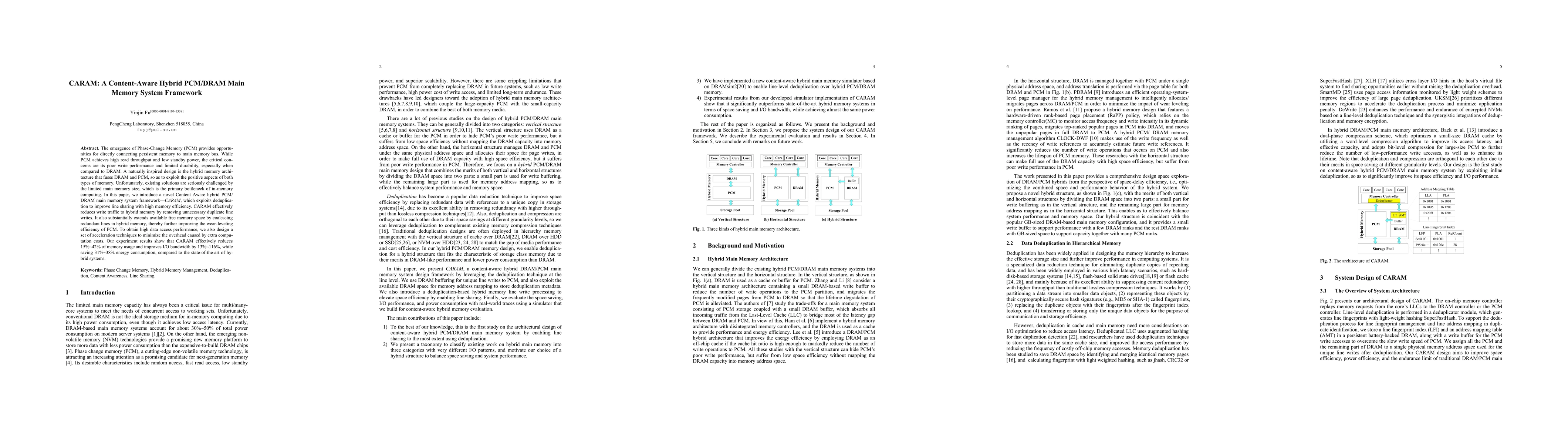 CARAM is a novel hybrid PCM/DRAM main memory system framework that leverages deduplication to enhance memory efficiency and reduce write traffic. It significantly improves I/O bandwidth and energy consumption while decreasing memory usage by up to 42% compared to existing hybrid systems.