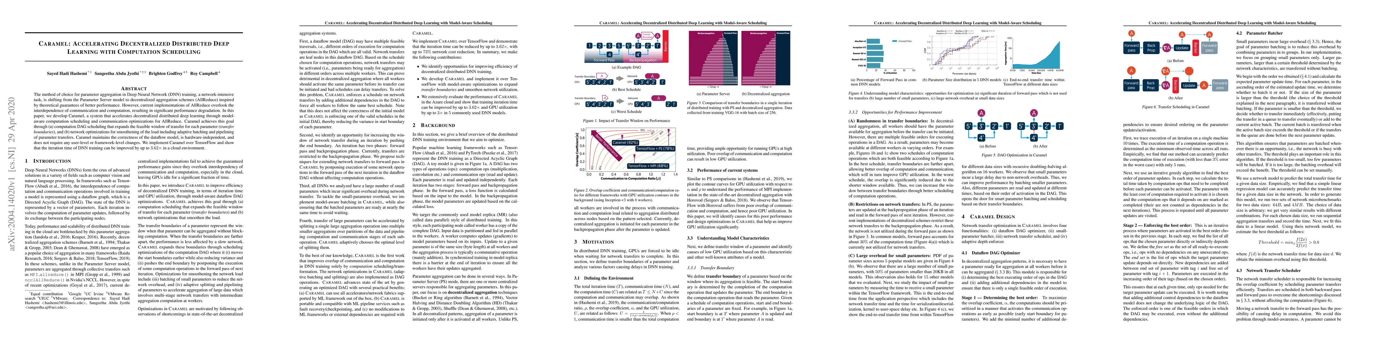 Caramel accelerates decentralized distributed deep learning by optimizing computation scheduling and communication for AllReduce. It achieves up to 3.62x improvement in DNN training iteration time through model-aware scheduling and network optimizations, without requiring any changes to existing frameworks.