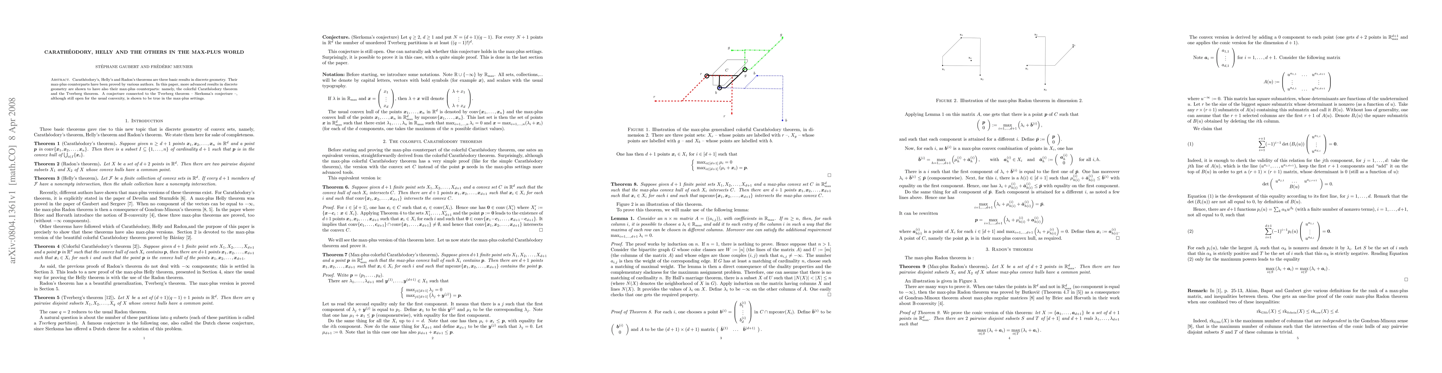 This paper explores the max-plus versions of Carathéodory's, Helly's, and Radon's theorems in discrete geometry, proving advanced results like the colorful Carathéodory theorem and the Tverberg theorem in this setting, and confirming Sierksma's conjecture in the max-plus framework.