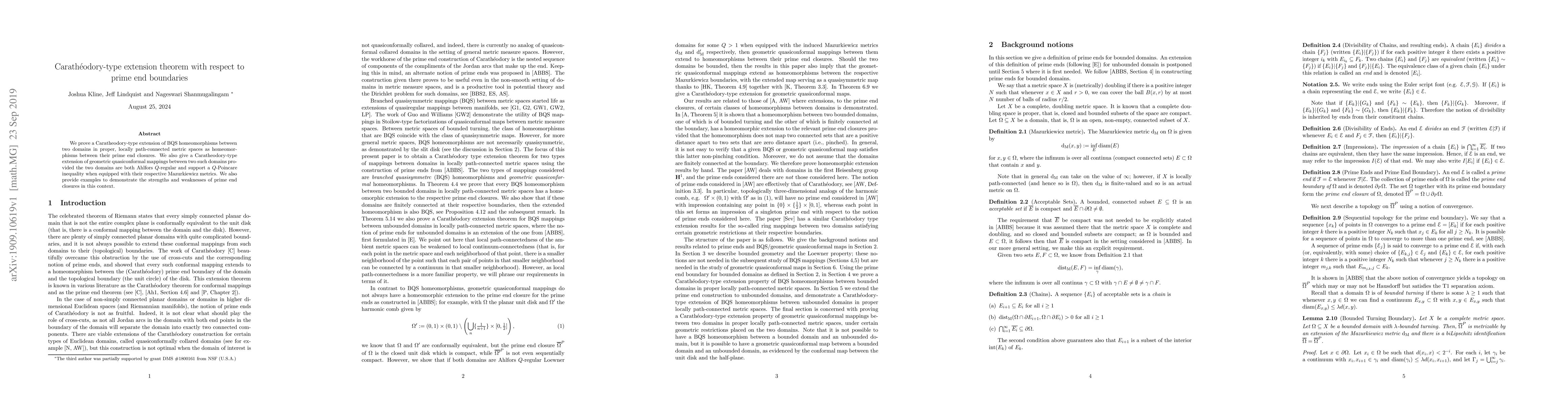 We prove a Carath\'eodory-type extension of BQS homeomorphisms between two domains in proper, locally path-connected metric spaces as homeomorphisms between their prime end closures. We also give a Carath\'eodory-type extension of geometric quasiconformal mappings between two such domains provided the two domains are both Ahlfors $Q$-regular and support a $Q$-Poincar\'e inequality when equipped with their respective Mazurkiewicz metrics. We also provide examples to demonstrate the strengths and weaknesses of prime end closures in this context.