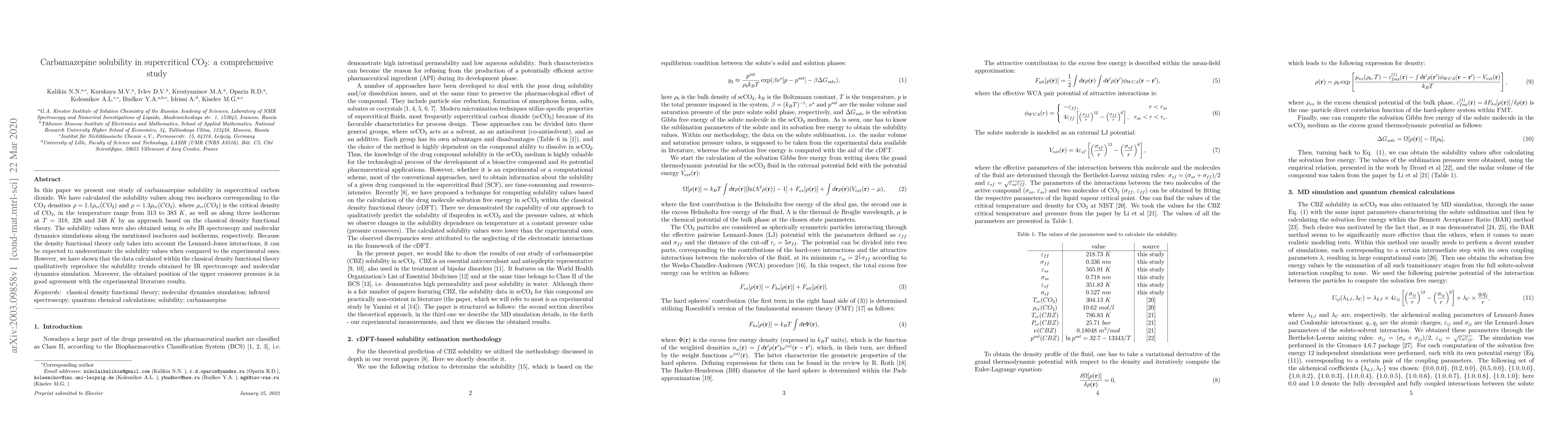 In this paper we present our study of carbamazepine solubility in supercritical carbon dioxide. We have calculated the solubility values along two isochores corresponding to the CO$_2$ densities $\rho = 1.1\rho_{cr}(CO_2)$ and $\rho= 1.3\rho_{cr}(CO_2)$, where $\rho_{cr}(CO_2)$ is the critical density of CO$_2$, in the temperature range from $313$ to $383~K$, as well as along three isotherms at $T=318$, $328$ and $348~K$ by an approach based on the classical density functional theory. The solubility values were also obtained using in situ IR spectroscopy and molecular dynamics simulations along the mentioned isochores and isotherms, respectively. Because the density functional theory only takes into account the Lennard-Jones interactions, it can be expected to underestimate the solubility values when compared to the experimental ones. However, we have shown that the data calculated within the classical density functional theory qualitatively reproduce the solubility trends obtained by IR spectroscopy and molecular dynamics simulation. Moreover, the obtained position of the upper crossover pressure is in good agreement with the experimental literature results.
