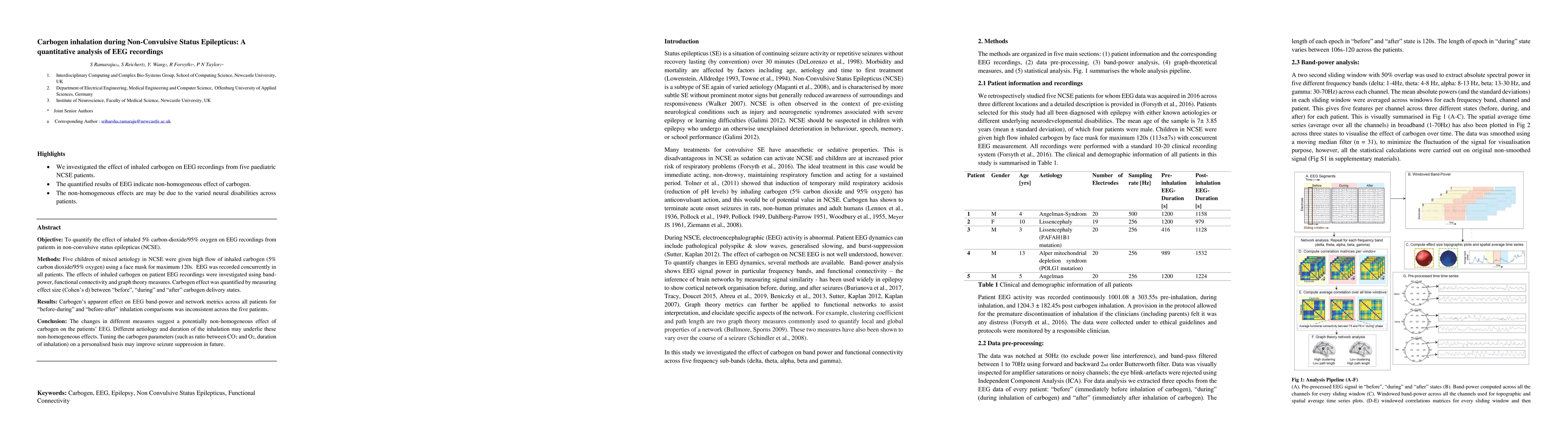 This study quantitatively measures the effect of inhaled carbogen on EEG recordings from children with non-convulsive status epilepticus, finding inconsistent effects across patients, suggesting a non-homogeneous impact that may vary with individual patient factors. Future research should consider personalized carbogen parameters for better seizure suppression.