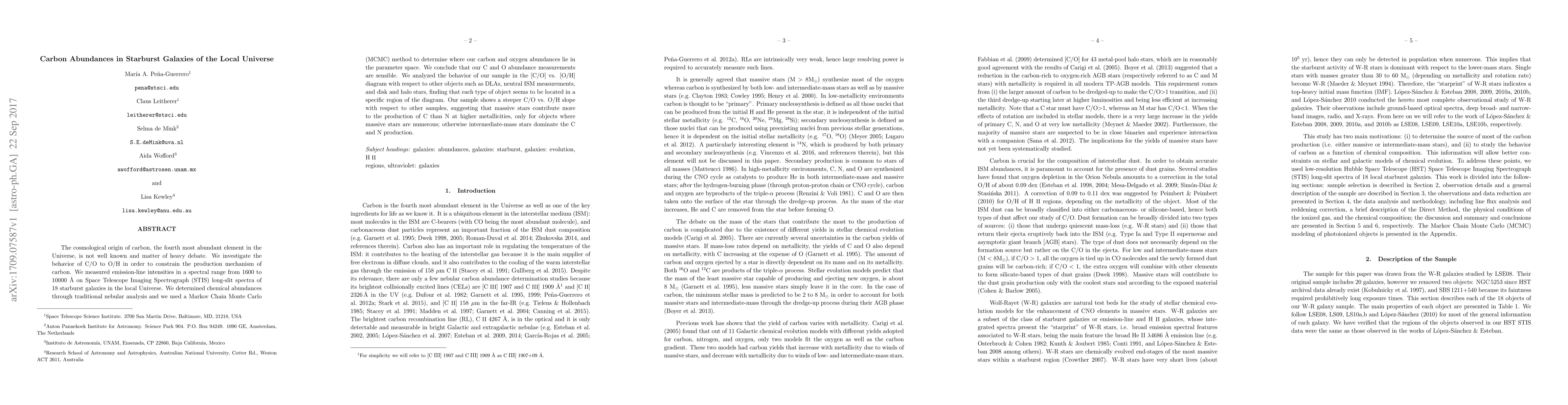 This study investigates carbon abundances in 18 local starburst galaxies using STIS spectra to determine C/O and O/H ratios, concluding that massive stars predominantly produce carbon at higher metallicities. The analysis reveals a steeper C/O vs. O/H slope compared to other samples, indicating different production mechanisms for carbon and nitrogen.