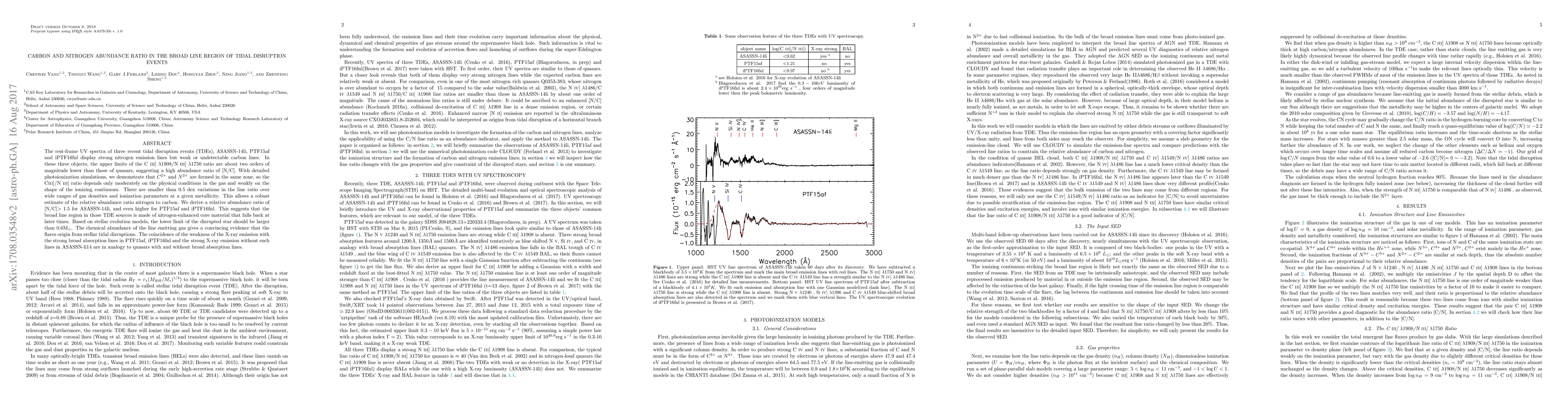 The rest-frame UV spectra of three recent tidal disruption events (TDEs), ASASSN-14li, PTF15af and iPTF16fnl display strong nitrogen emission lines but weak or undetectable carbon lines. In these three objects, the upper limits of the C III] $\lambda 1908$/N III] $\lambda 1750$ ratio are about two orders of magnitude lower than those of quasars, suggesting a high abundance ratio of [N/C]. With detailed photoionization simulations, we demonstrate that $C^{2+}$ and $N^{2+}$ are formed in the same zone, so the C III]/N III] ratio depends only moderately on the physical conditions in the gas and weakly on the shape of the ionizing continuum. There are smaller than $0.5$ dex variations in the line ratio over wide ranges of gas densities and ionization parameters at a given metallicity. This allows a robust estimate of the relative abundance ratio nitrogen to carbon. We derive a relative abundance ratio of [N/C]$>1.5$ for ASASSN-14li, and even higher for PTF15af and iPTF16fnl. This suggests that the broad line region in those TDE sources is made of nitrogen-enhanced core material that falls back at later times. Based on stellar evolution models, the lower limit of the disrupted star should be larger than 0.6M$_{\odot}$. The chemical abundance of the line emitting gas gives a convincing evidence that the flares origin from stellar tidal disruptions. The coincidence of the weakness of the X-ray emission with the strong broad absorption lines in PTF15af, iPTF16fnl and the strong X-ray emission without such lines in ASASSN-li14 are in analogy to quasars with and without broad absorption lines.