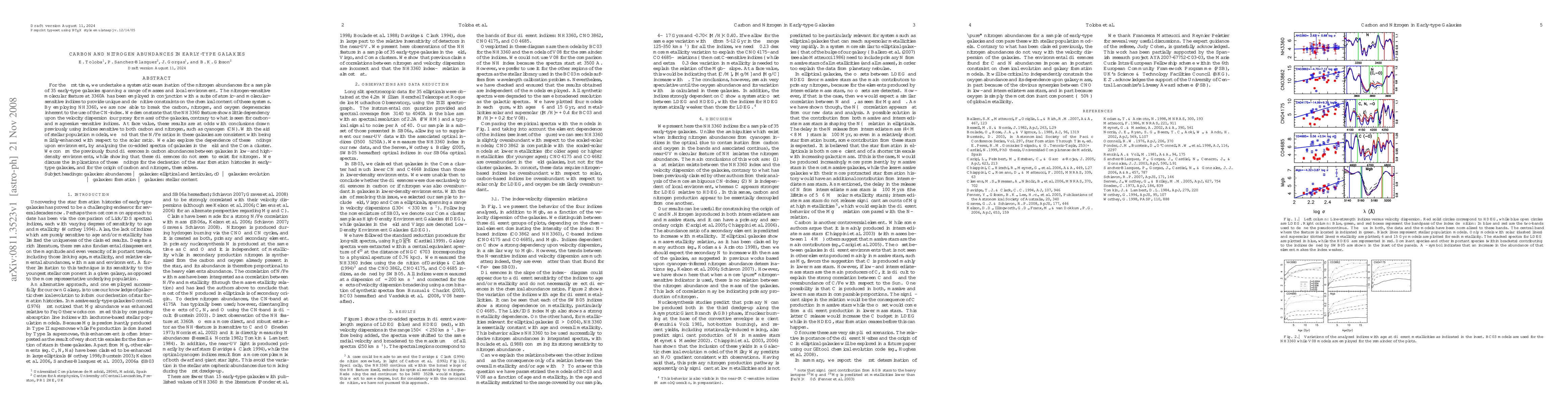 Researchers analyzed 35 early-type galaxies to understand their carbon and nitrogen abundances, finding that nitrogen levels are consistently enhanced compared to the solar ratio, while carbon levels vary depending on environment.
