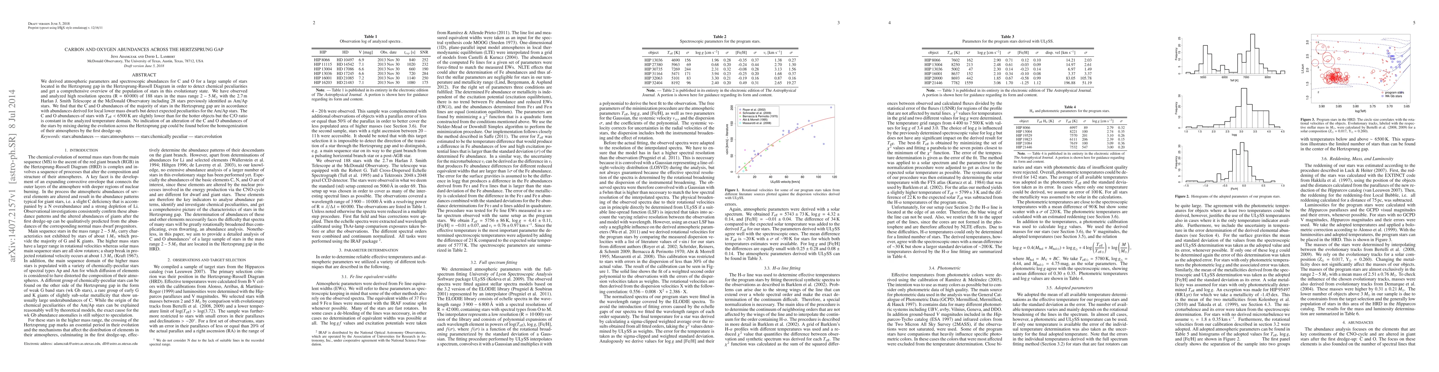 We derived atmospheric parameters and spectroscopic abundances for C and O for a large sample of stars located in the Hertzsprung gap in the Hertzsprung-Russell Diagram in order to detect chemical peculiarities and get a comprehensive overview of the population of stars in this evolutionary state. We have observed and analyzed high resolution spectra (R = 60 000) of 188 stars in the mass range 2 - 5 Msun with the 2.7 m Harlan J. Smith Telescope at the McDonald Observatory including 28 stars previously identified as Am/Ap stars. We find that the C and O abundances of the majority of stars in the Hertzsprung gap are in accordance with abundances derived for local lower mass dwarfs but detect expected peculiarities for the Am/Ap stars. The C and O abundances of stars with Teff < 6500 K are slightly lower than for the hotter objects but the C/O ratio is constant in the analyzed temperature domain. No indication of an alteration of the C and O abundances of the stars by mixing during the evolution across the Hertzsprung gap could be found before the homogenization of their atmospheres by the first dredge-up.