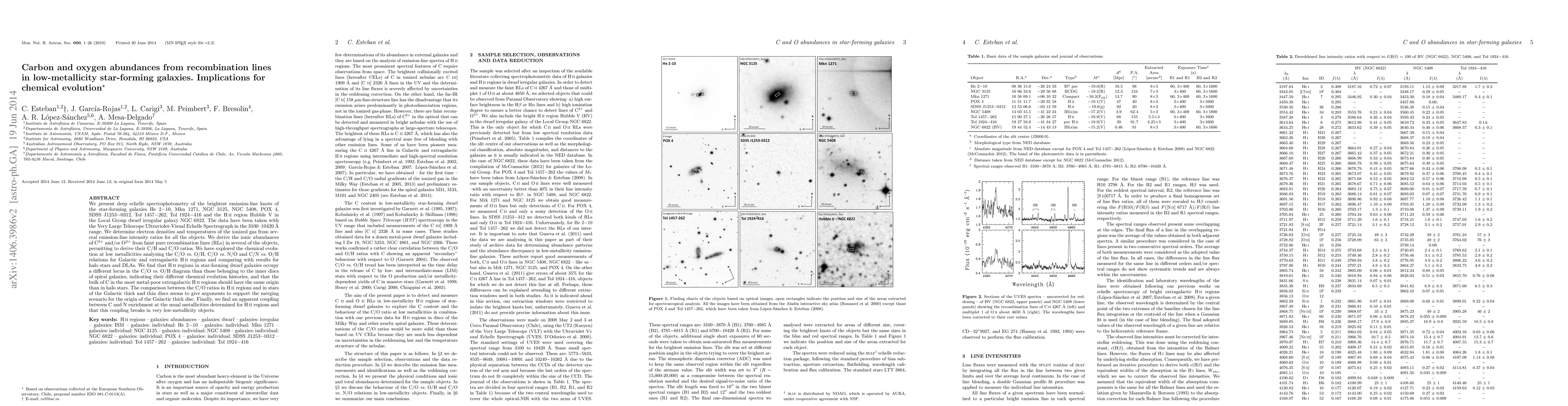 We present deep echelle spectrophotometry of the brightest emission-line knots of the star-forming galaxies He 2-10, Mkn 1271, NGC 3125, NGC 5408, POX 4, SDSS J1253-0312, Tol 1457-262, Tol 1924-416 and the HII region Hubble V in the Local Group dwarf irregular galaxy NGC 6822. The data have been taken with the Very Large Telescope Ultraviolet-Visual Echelle Spectrograph in the 3100-10420 {\AA} range. We determine electron densities and temperatures of the ionized gas from several emission-line intensity ratios for all the objects. We derive the ionic abundances of C$^{2+}$ and/or O$^{2+}$ from faint pure recombination lines (RLs) in several of the objects, permitting to derive their C/H and C/O ratios. We have explored the chemical evolution at low metallicities analysing the C/O vs. O/H, C/O vs. N/O and C/N vs. O/H relations for Galactic and extragalactic HII regions and comparing with results for halo stars and DLAs. We find that HII regions in star-forming dwarf galaxies occupy a different locus in the C/O vs. O/H diagram than those belonging to the inner discs of spiral galaxies, indicating their different chemical evolution histories, and that the bulk of C in the most metal-poor extragalactic HII regions should have the same origin than in halo stars. The comparison between the C/O ratios in HII regions and in stars of the Galactic thick and thin discs seems to give arguments to support the merging scenario for the origin of the Galactic thick disc. Finally, we find an apparent coupling between C and N enrichment at the usual metallicities determined for HII regions and that this coupling breaks in very low-metallicity objects.