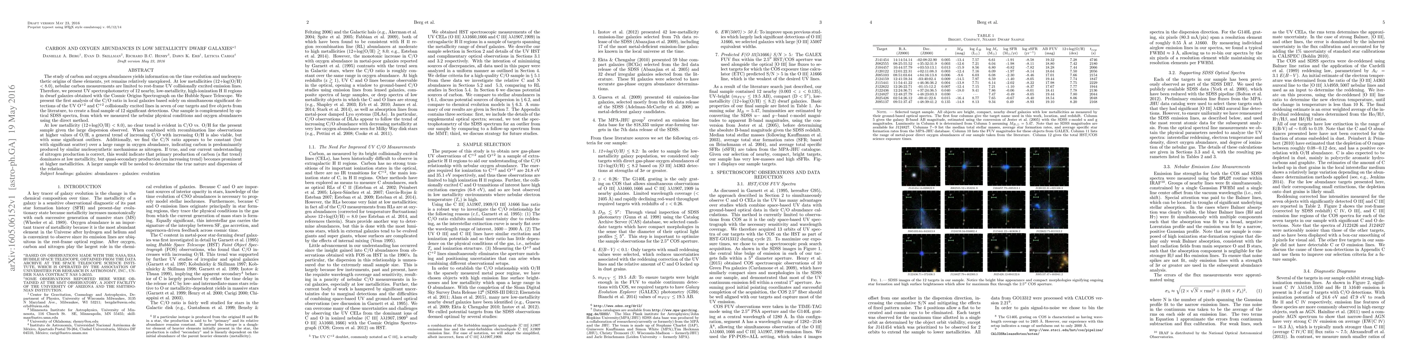 This paper investigates carbon and oxygen abundances in low metallicity dwarf galaxies using UV spectrophotometry from the Hubble Space Telescope. It finds no clear trend in the C/O ratio at low metallicities but suggests that primary carbon production dominates at low metallicity, with a potential shift to quasi-secondary production at higher metallicities.