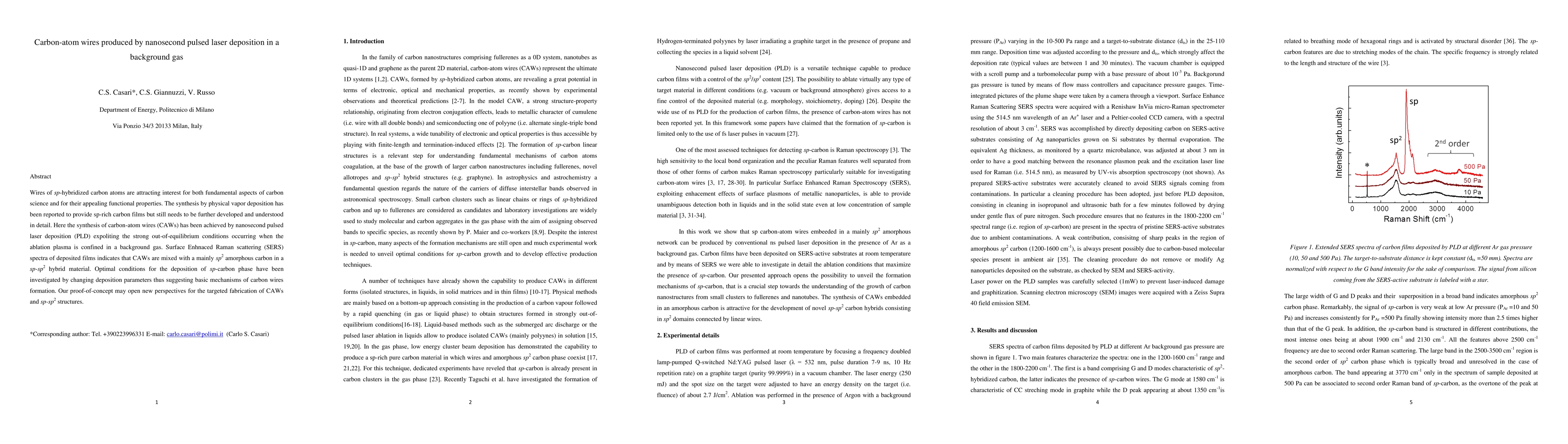 This paper reports the synthesis of carbon-atom wires (CAWs) using nanosecond pulsed laser deposition in a background gas, revealing a hybrid $sp-sp^2$ material structure. Optimal deposition conditions were identified to enhance sp-carbon phase, suggesting mechanisms for CAW formation and potential for future targeted fabrication.