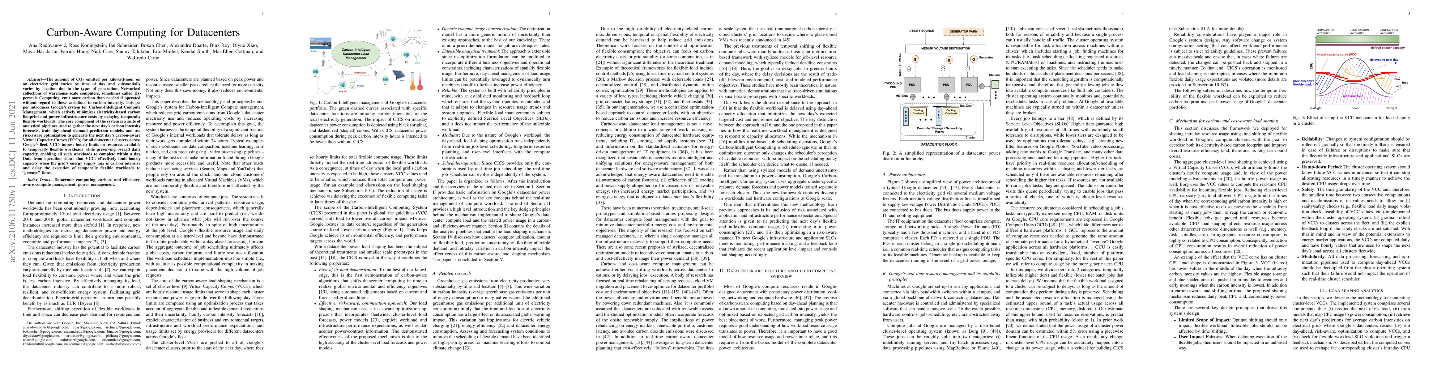This paper introduces Google's Carbon-Intelligent Compute Management system, which optimizes datacenter operations to minimize carbon emissions by delaying workloads during high-carbon periods and predicting future energy demand, thereby reducing both emissions and costs. The system uses Virtual Capacity Curves to manage resource allocation dynamically.