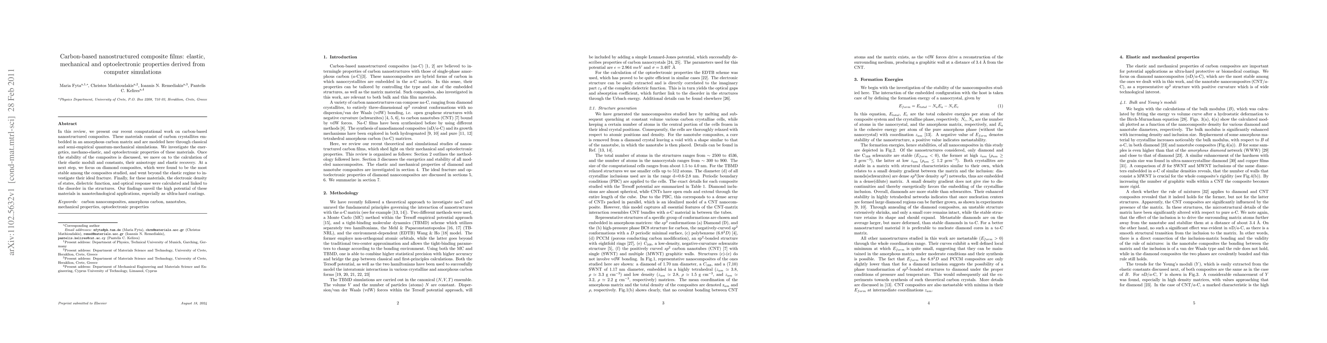 In this review, we present our recent computational work on carbon-based nanostructured composites. These materials consist of carbon crystallites embedded in an amorphous carbon matrix and are modeled here through classical and semi-empirical quantum-mechanical simulations. We investigate the energetics, mechano-elastic, and optoelectronic properties of these materials. Once the stability of the composites is discussed, we move on to the calculation of their elastic moduli and constants, their anisotropy and elastic recovery. At a next step, we focus on diamond composites, which were found to be the most stable among the composites studied, and went beyond the elastic regime to investigate their ideal fracture. Finally, for these materials, the electronic density of states, dielectric function, and optical response were calculated and linked to the disorder in the structures. Our findings unveil the high potential of these materials in nanotechnological applications, especially as ultlra-hard coatings.