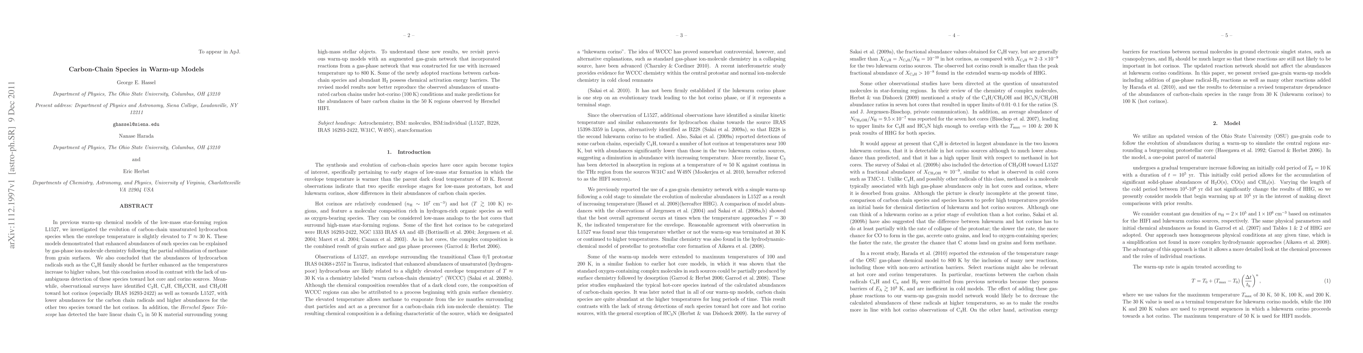In previous warm-up chemical models of the low-mass star-forming region L1527, we investigated the evolution of carbon-chain unsaturated hydrocarbon species when the envelope temperature is slightly elevated to $T\approx 30$ K. These models demonstrated that enhanced abundances of such species can be explained by gas-phase ion-molecule chemistry following the partial sublimation of methane from grain surfaces. We also concluded that the abundances of hydrocarbon radicals such as the C$_{\rm n}$H family should be further enhanced as the temperatures increase to higher values, but this conclusion stood in contrast with the lack of unambiguous detection of these species toward hot core and corino sources. Meanwhile, observational surveys have identified C$_2$H, C$_4$H, CH$_3$CCH, and CH$_3$OH toward hot corinos (especially IRAS 16293-2422) as well as towards L1527, with lower abundances for the carbon chain radicals and higher abundances for the other two species toward the hot corinos. In addition, the {\it Herschel Space Telescope} has detected the bare linear chain C$_3$ in 50 K material surrounding young high-mass stellar objects. To understand these new results, we revisit previous warm-up models with an augmented gas-grain network that incorporated reactions from a gas-phase network that was constructed for use with increased temperature up to 800 K. Some of the newly adopted reactions between carbon-chain species and abundant H$_2$ possess chemical activation energy barriers. The revised model results now better reproduce the observed abundances of unsaturated carbon chains under hot-corino (100 K) conditions and make predictions for the abundances of bare carbon chains in the 50 K regions observed by Herschel HIFI.