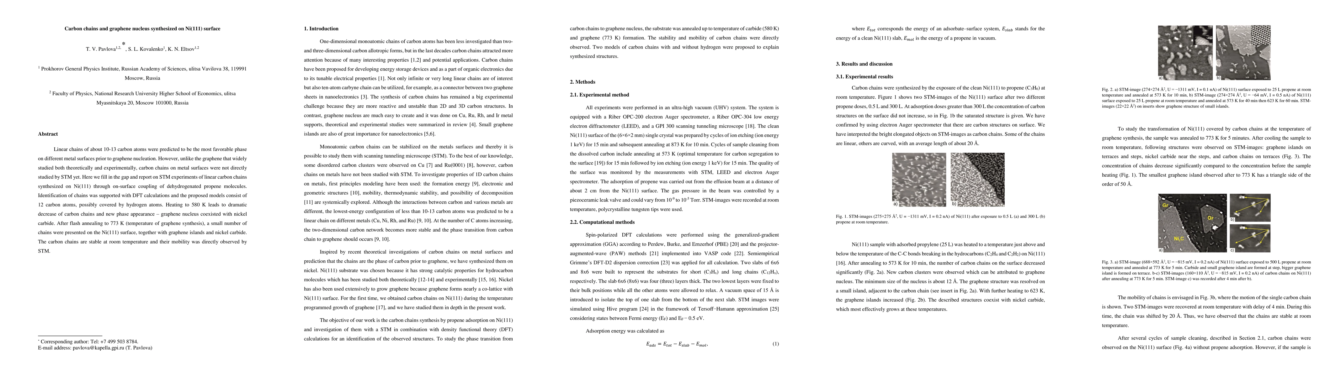 The paper presents experimental evidence and DFT modeling of linear carbon chains on Ni(111) synthesized from dehydrogenated propene, demonstrating their stability and transformation into graphene nuclei under controlled annealing.