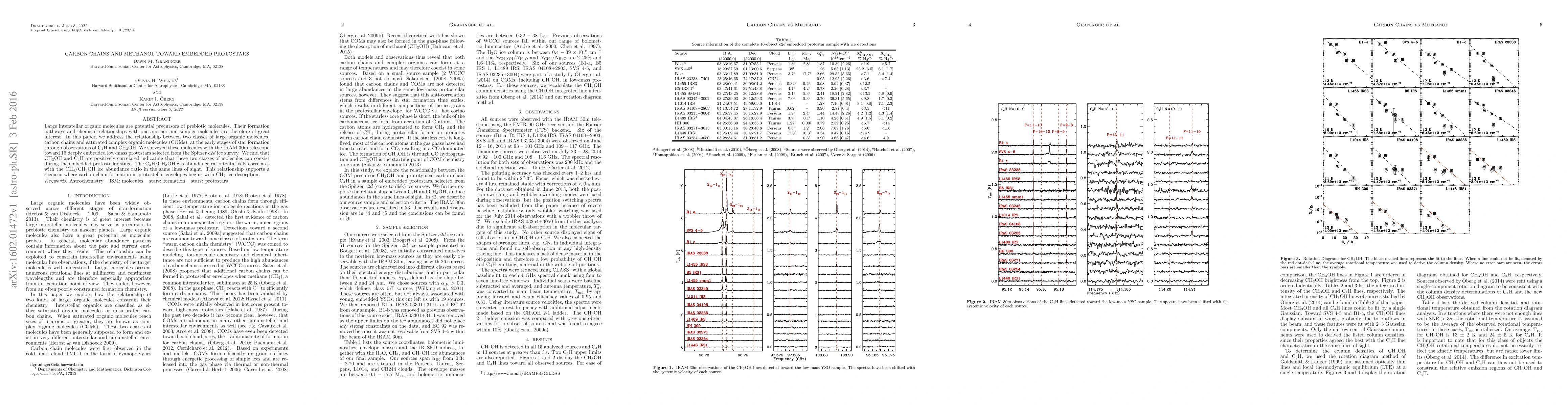 Large interstellar organic molecules are potential precursors of prebiotic molecules. Their formation pathways and chemical relationships with one another and simpler molecules are therefore of great interest. In this paper, we address the relationship between two classes of large organic molecules, carbon chains and saturated complex organic molecules (COMs), at the early stages of star formation through observations of C4H and CH3OH. We surveyed these molecules with the IRAM 30m telescope toward 16 deeply embedded low-mass protostars selected from the Spitzer c2d ice survey. We find that CH3OH and C4H are positively correlated indicating that these two classes of molecules can coexist during the embedded protostellar stage. The C4H/CH3OH gas abundance ratio tentatively correlates with the CH4/CH3OH ice abundance ratio in the same lines of sight. This relationship supports a scenario where carbon chain formation in protostellar envelopes begins with CH4 ice desorption.