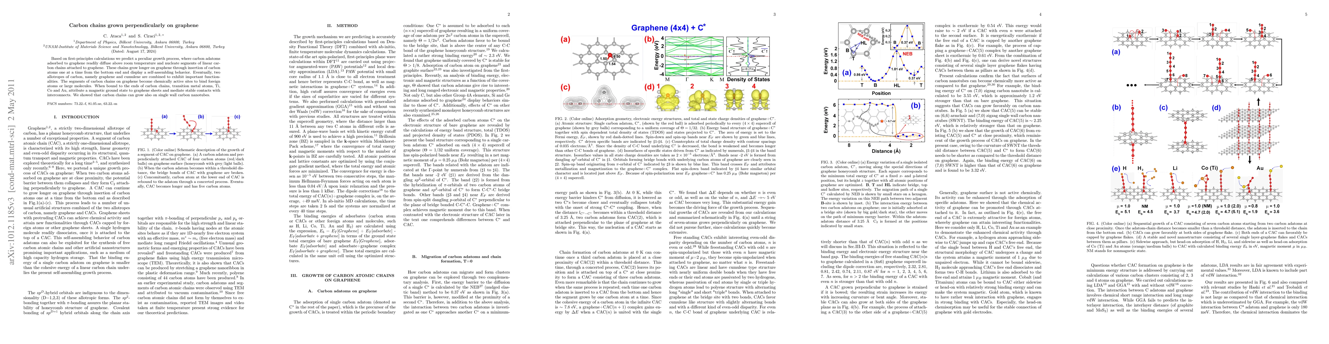 This research predicts a unique growth process where carbon adatoms on graphene self-assemble into linear carbon chains that grow perpendicularly, potentially creating magnetic functionalities when bound to transition metals, and demonstrating growth on single wall carbon nanotubes as well.