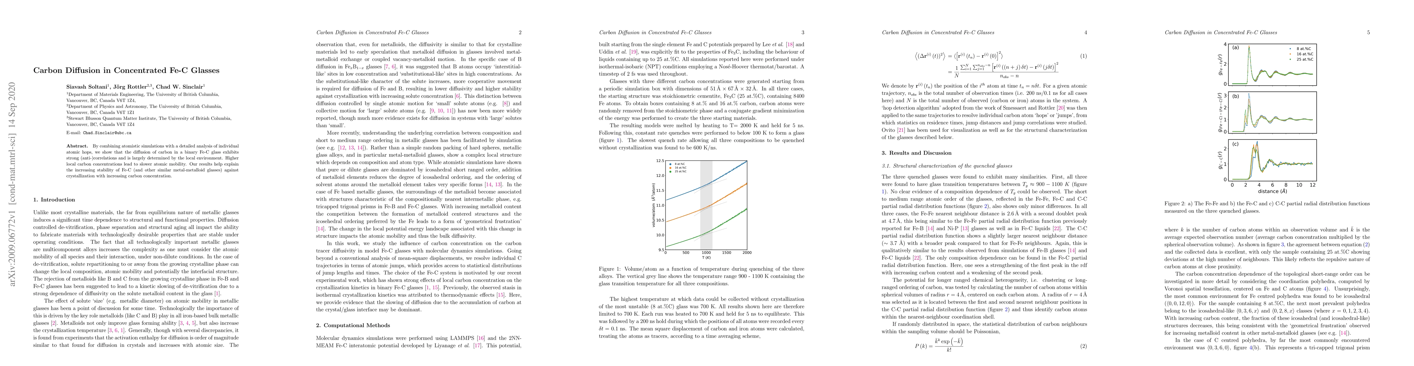 Carbon diffusion in Fe-C glasses is slowed by high local carbon concentrations, leading to increased stability against crystallization.