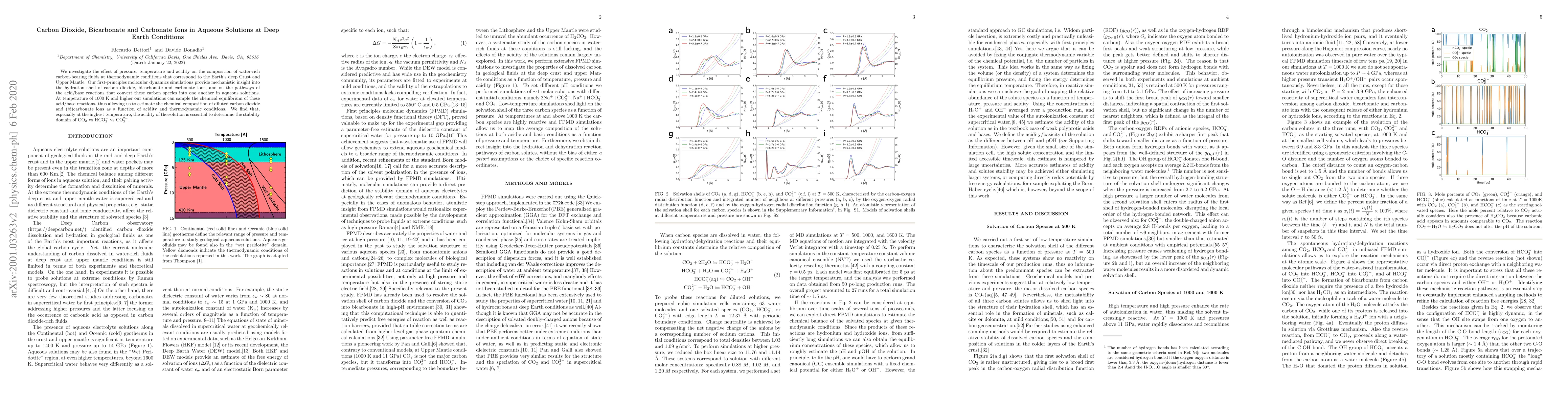 This study investigates the behavior of carbon dioxide, bicarbonate, and carbonate ions in aqueous solutions under deep Earth conditions using molecular dynamics simulations. The research reveals that acidity significantly influences the stability domains of these carbon species, especially at high temperatures, providing insights into their chemical equilibria and reaction pathways.