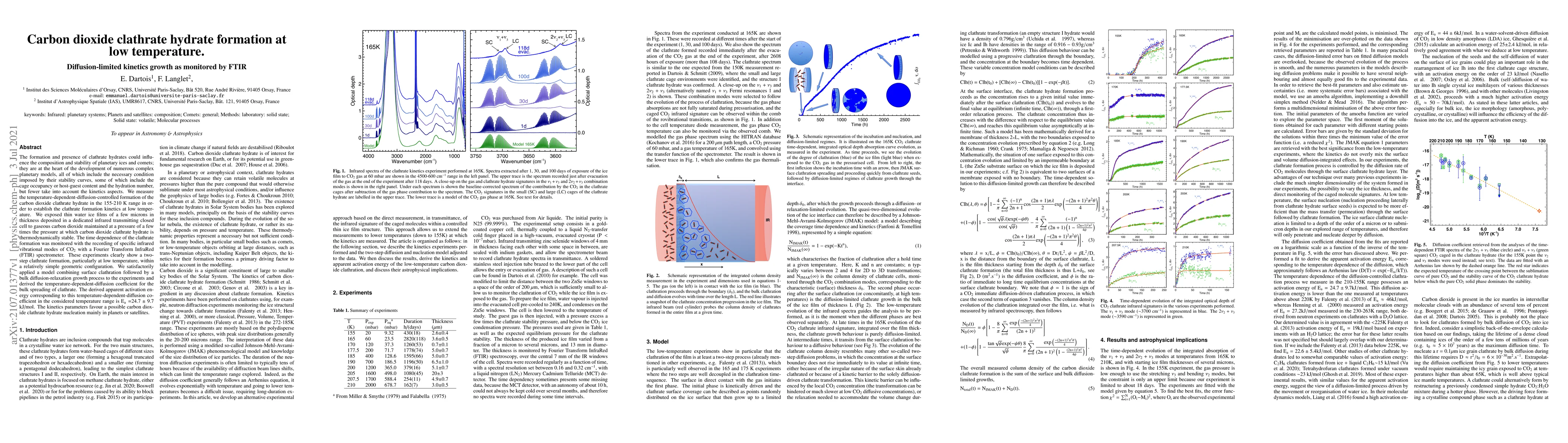 This study investigates the diffusion-limited kinetics of carbon dioxide clathrate hydrate formation at low temperatures, using FTIR spectroscopy to monitor the process. The experiments reveal a two-step formation mechanism, with derived activation energy E_a = 24.7 +/- 9.7 kJ/mol, suggesting potential nucleation in planetary environments.