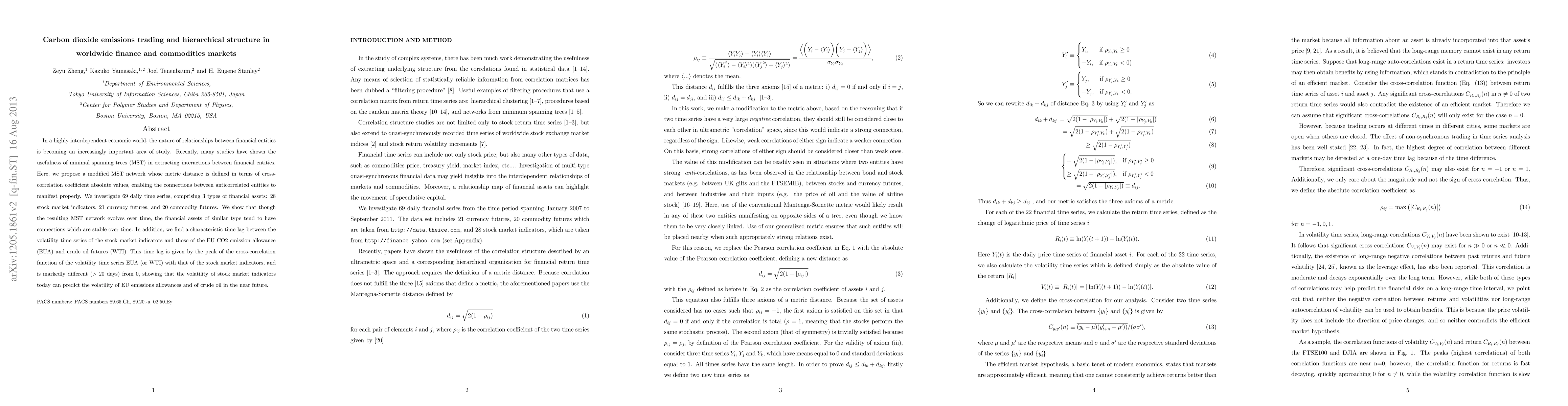 In a highly interdependent economic world, the nature of relationships between financial entities is becoming an increasingly important area of study. Recently, many studies have shown the usefulness of minimal spanning trees (MST) in extracting interactions between financial entities. Here, we propose a modified MST network whose metric distance is defined in terms of cross-correlation coefficient absolute values, enabling the connections between anticorrelated entities to manifest properly. We investigate 69 daily time series, comprising three types of financial assets: 28 stock market indicators, 21 currency futures, and 20 commodity futures. We show that though the resulting MST network evolves over time, the financial assets of similar type tend to have connections which are stable over time. In addition, we find a characteristic time lag between the volatility time series of the stock market indicators and those of the EU CO2 emission allowance (EUA) and crude oil futures (WTI). This time lag is given by the peak of the cross-correlation function of the volatility time series EUA (or WTI) with that of the stock market indicators, and is markedly different (>20 days) from 0, showing that the volatility of stock market indicators today can predict the volatility of EU emissions allowances and of crude oil in the near future.