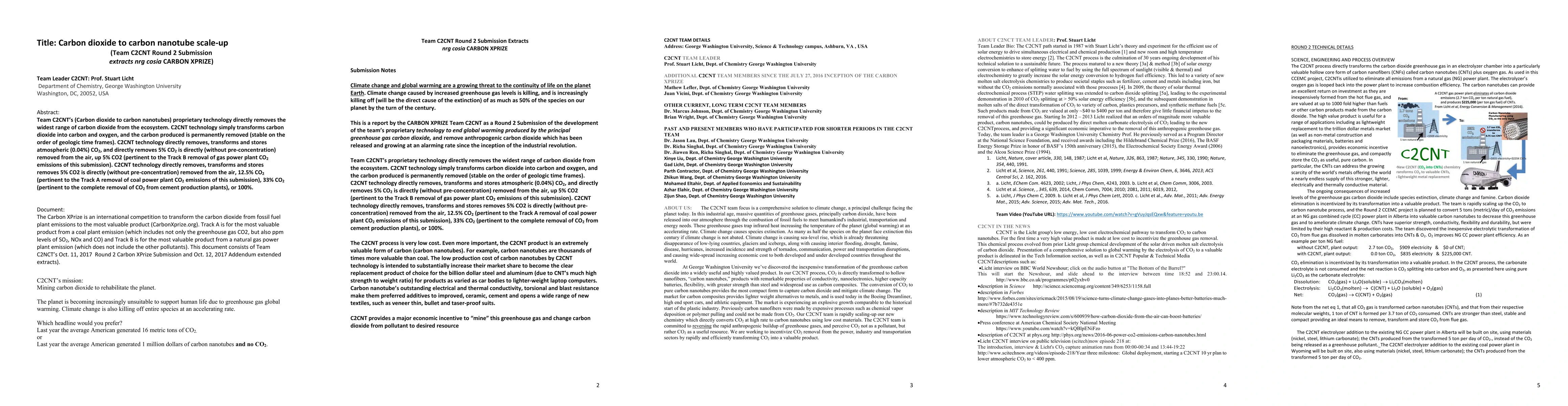 Team C2CNT, or team Carbon dioxide to carbon nanotubes, proprietary technology directly removes the widest range of carbon dioxide from the ecosystem. C2CNT technology simply transforms low to high carbon dioxide into carbon and oxygen, and the carbon produced is permanently removed, that is stable on the order of geologic time frames. C2CNT technology directly removes, transforms and stores atmospheric 0.04% CO2 without pre-concentration from the air, or 5% CO2 removal of gas power plant CO2 emissions, or 12.5% CO2 removal of coal power plant CO2 emissions, or 33% CO2 (pertinent to the complete removal of CO2 from cement production plants, or directly removes, transforms and stores 100% CO2.