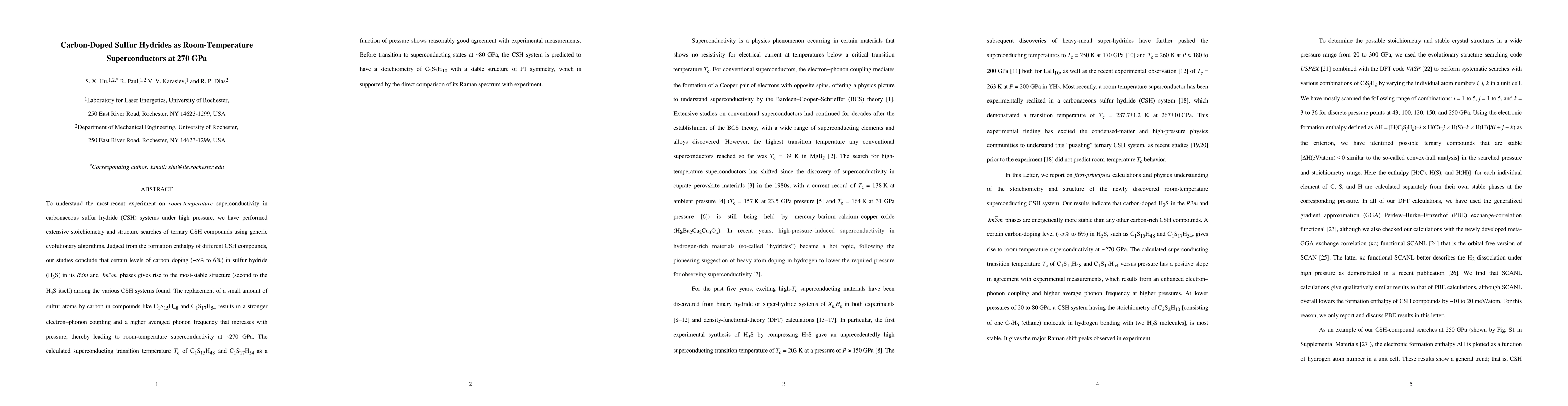To understand the most-recent experiment on room-temperature superconductivity in carbonaceous sulfur hydride (CSH) systems under high pressure, we have performed extensive stoichiometry and structure searches of ternary CSH compounds using generic evolutionary algorithms. Judged from the formation enthalpy of different CSH compounds, our studies conclude that certain levels of carbon doping (~5%-6%) in sulfur hydride (H$_3$S) in its R3m and phases gives rise to the most-stable structure (second to the H$_3$S itself) among the various CSH systems found. The replacement of a small amount of sulfur atoms by carbon in compounds like C$_1$S$_{15}$H$_{48}$ and C$_1$S$_{17}$H$_{54}$ results in a stronger electron-phonon coupling and a higher averaged phonon frequency that increases with pressure, thereby leading to room-temperature superconductivity at ~270 GPa. The calculated superconducting transition temperature T$_c$ of C$_1$S$_{15}$H$_{48}$ and C$_1$S$_{17}$H$_{54}$ as a function of pressure shows reasonably good agreement with experimental measurements. Before transition to superconducting states at ~80 GPa, the CSH system is predicted to have a stoichiometry of C$_2$S$_2$H$_{10}$ with a stable structure of P1 symmetry, which is supported by the direct comparison of its Raman spectrum with experiment.