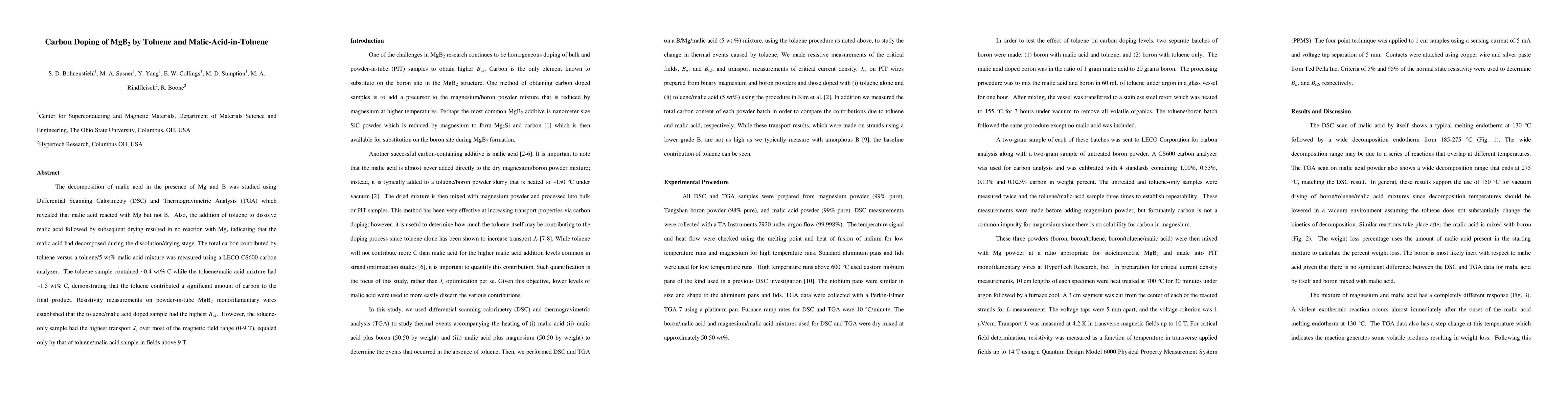 The study investigated carbon doping of MgB2 using toluene and malic-acid-in-toluene through DSC, TGA, and resistivity measurements.