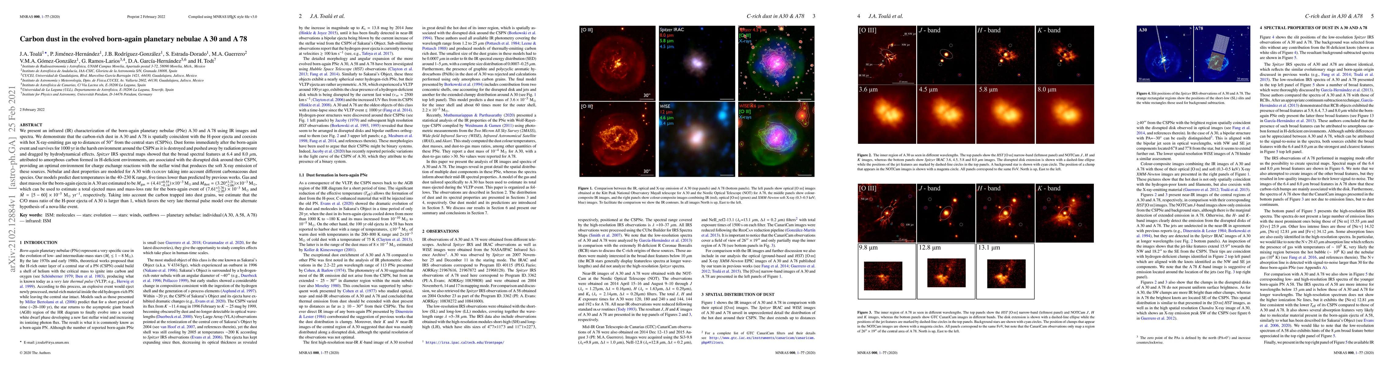 We present an infrared (IR) characterization of the born-again planetary nebulae (PNe) A30 and A78 using IR images and spectra. We demonstrate that the carbon-rich dust in A30 and A78 is spatially coincident with the H-poor ejecta and coexists with hot X-ray-emitting gas up to distances of 50$''$ from the central stars (CSPNs). Dust forms immediately after the born-again event and survives for 1000 yr in the harsh environment around the CSPN as it is destroyed and pushed away by radiation pressure and dragged by hydrodynamical effects. Spitzer IRS spectral maps showed that the broad spectral features at 6.4 and 8.0 $\mu$m, attributed to amorphous carbon formed in H-deficient environments, are associated with the disrupted disk around their CSPN, providing an optimal environment for charge exchange reactions with the stellar wind that produces the soft X-ray emission of these sources. Nebular and dust properties are modeled for A30 with Cloudy taking into account different carbonaceous dust species. Our models predict dust temperatures in the 40-230 K range, five times lower than predicted by previous works. Gas and dust masses for the born-again ejecta in A30 are estimated to be $M_\mathrm{gas}=(4.41^{+0.55}_{-0.14})\times10^{-3}$ M$_\odot$ and $M_\mathrm{dust}=(3.20^{+3.21}_{-2.06})\times10^{-3}$ M$_\odot$, which can be used to estimate a total ejected mass and mass-loss rate for the born-again event of $(7.61^{+3.76}_{-2.20})\times10^{-3}$ M$_{\odot}$ and $\dot{M}=[5-60]\times10^{-5}$ M$_{\odot}$ yr$^{-1}$, respectively. Taking into account the carbon trapped into dust grains, we estimate that the C/O mass ratio of the H-poor ejecta of A30 is larger than 1, which favors the very late thermal pulse model over the alternate hypothesis of a nova-like event.