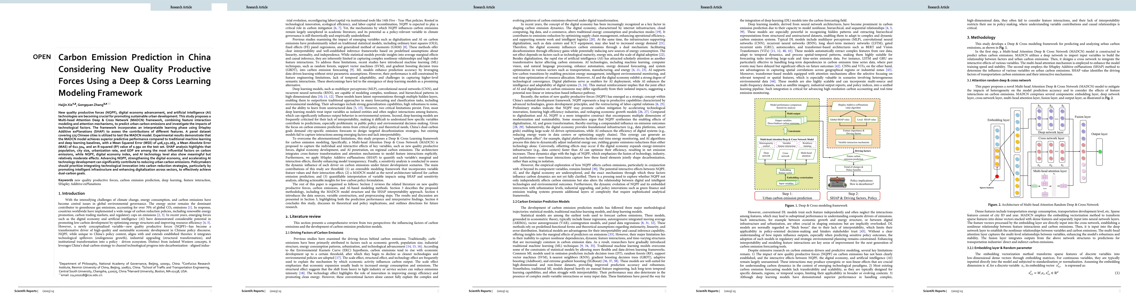 The study employs a Multi-head Attention Deep&Cross Network (MADCN) framework to analyze the interactions between new quality productive forces (NQPF), digital economy, AI technology, and urban carbon emissions using a panel dataset of 275 Chinese cities from 2009 to 2021. SHAP analysis is used to interpret model predictions and assess variable impacts.