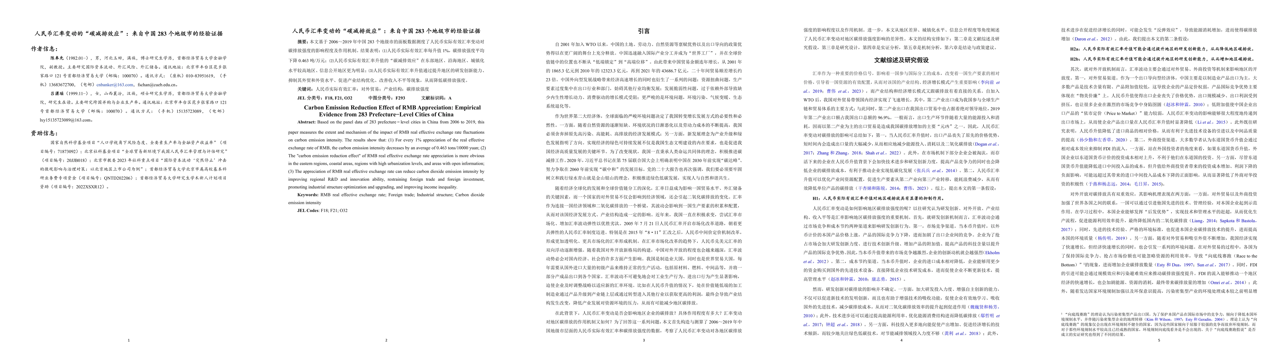 This paper examines the impact of RMB appreciation on carbon emission intensity in 283 Chinese prefecture-level cities from 2006 to 2019, finding that a 1% appreciation reduces carbon emissions by 0.463 tons/10000 yuan, with stronger effects in eastern, coastal, and highly urbanized regions. The reduction is attributed to enhanced R&D, restrained foreign trade, industrial optimization, and improved income inequality.