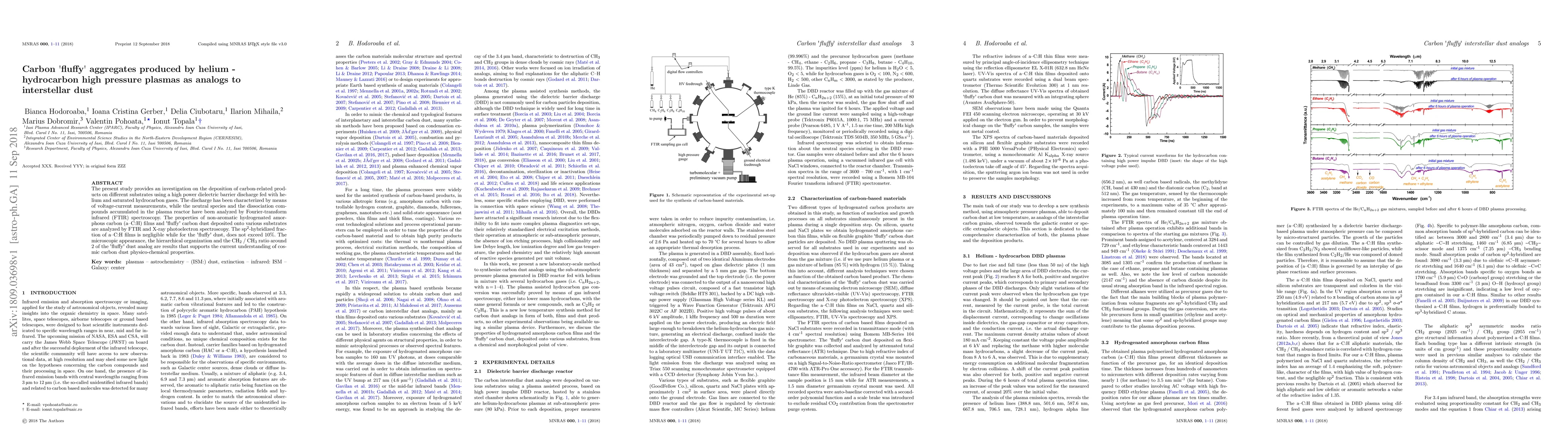 The present study provides an investigation on the deposition of carbon-related products on different substrates using a high power dielectric barrier discharge fed with helium and saturated hydrocarbon gases. The discharge has been characterized by means of voltage-current measurements, while the neutral species and the dissociation compounds accumulated in the plasma reactor have been analyzed by Fourier-transform infrared (FTIR) spectroscopy. The properties of non-aromatic hydrogenated amorphous carbon (a-C:H) films and 'fluffy' carbon dust deposited onto various substrates are analyzed by FTIR and X-ray photoelectron spectroscopy. The sp2-hybridized fraction of a-C:H films is negligible while for the 'fluffy' dust, does not exceed 10%. The microscopic appearance, the hierarchical organization and the CH2 / CH3 ratio around 2 of the 'fluffy' dust analog are results that supports the current understanding of cosmic carbon dust physico-chemical properties.
