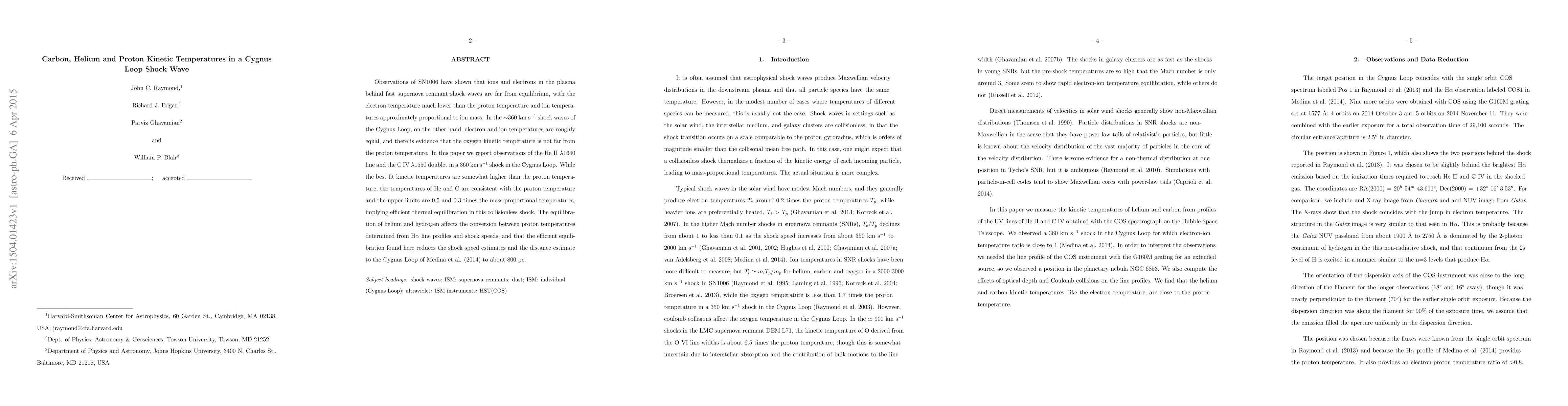 This paper investigates the kinetic temperatures of carbon, helium, and protons in the Cygnus Loop shock wave, finding efficient thermal equilibration among these particles. Observations reveal that the temperatures of helium and carbon align closely with the proton temperature, suggesting a reduction in shock speed and distance estimates to approximately 800 pc.