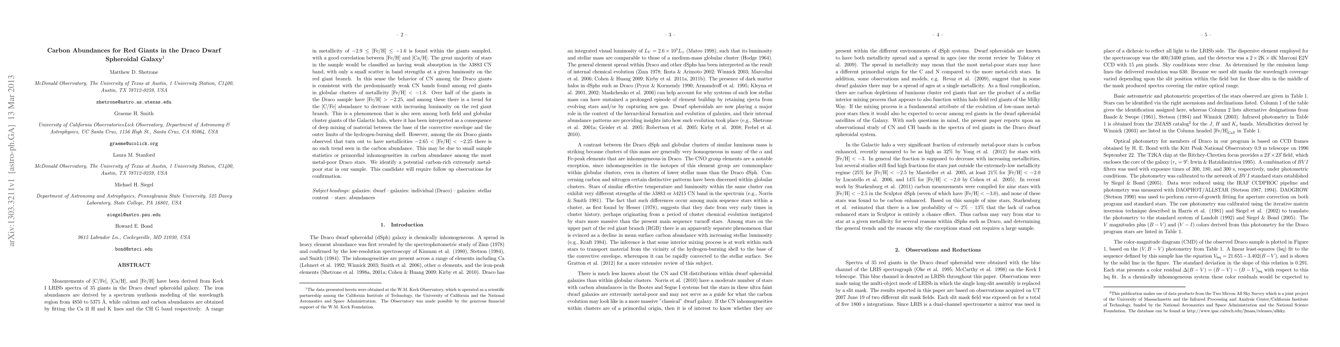 Researchers found a range of metallicity in Draco dwarf spheroidal galaxy giants, with most having weak CN band absorption, and some showing unusual trends in carbon abundance vs luminosity on the red giant branch.