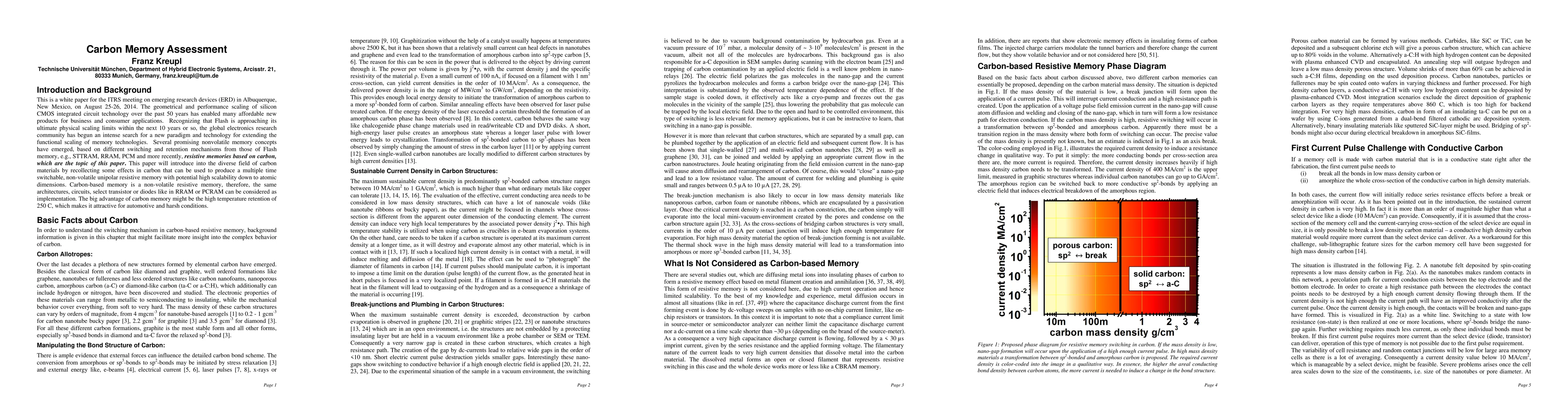 The geometrical and performance scaling of silicon CMOS integrated circuit technology over the past 50 years has enabled many affordable new products for business and consumer applications. Recognizing that Flash is approaching its ultimate physical scaling limits within the next 10 years or so, the global electronics research community has begun an intense search for a new paradigm and technology for extending the functional scaling of memory technologies. Several promising nonvolatile memory concepts have emerged, based on different switching and retention mechanisms from those of Flash memory, e.g., STTRAM, RRAM, PCM and more recently, resistive memories based on carbon, which are the topic of this paper. This paper will introduce into the diverse field of carbon materials by recollecting some effects in carbon that can be used to produce a multiple time switchable, non-volatile unipolar resistive memory with potential high scalability down to atomic dimensions. Carbon-based memory is a non-volatile resistive memory, therefore, the same architectures, circuits, select transistor or diodes like in ReRAM or PCRAM can be considered as implementation. The big advantage of carbon memory might be the high temperature retention of 250 C, which makes it attractive for automotive and harsh conditions. This is a white paper for the ITRS meeting on emerging research devices (ERD) in Albuquerque, New Mexico, on August 25-26, 2014.