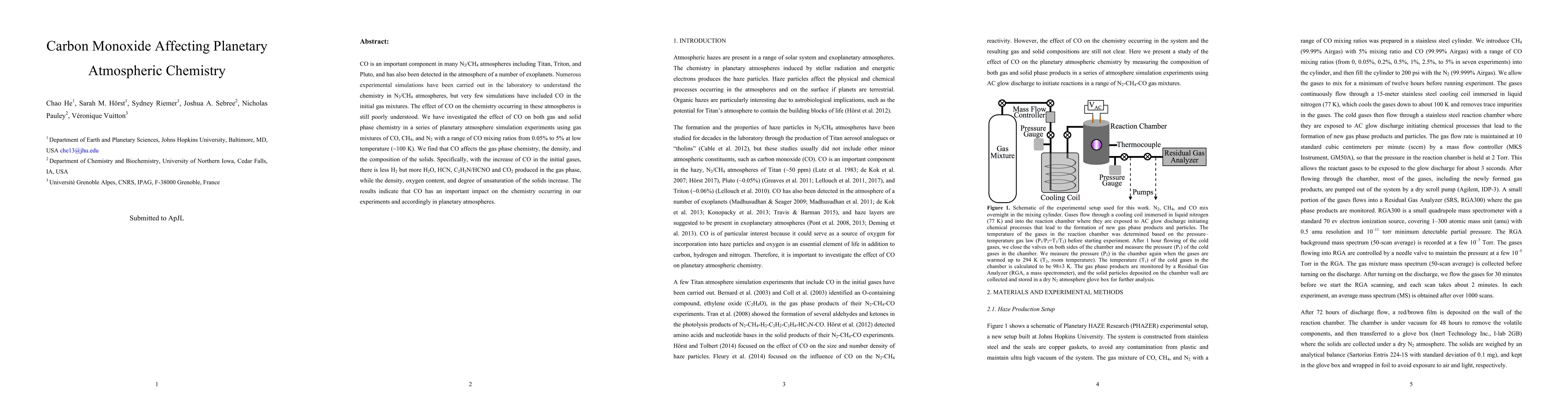 CO is an important component in many N2/CH4 atmospheres including Titan, Triton, and Pluto, and has also been detected in the atmosphere of a number of exoplanets. Numerous experimental simulations have been carried out in the laboratory to understand the chemistry in N2/CH4 atmospheres, but very few simulations have included CO in the initial gas mixtures. The effect of CO on the chemistry occurring in these atmospheres is still poorly understood. We have investigated the effect of CO on both gas and solid phase chemistry in a series of planetary atmosphere simulation experiments using gas mixtures of CO, CH4, and N2 with a range of CO mixing ratios from 0.05% to 5% at low temperature (~100 K). We find that CO affects the gas phase chemistry, the density, and the composition of the solids. Specifically, with the increase of CO in the initial gases, there is less H2 but more H2O, HCN, C2H5N/HCNO and CO2 produced in the gas phase, while the density, oxygen content, and degree of unsaturation of the solids increase. The results indicate that CO has an important impact on the chemistry occurring in our experiments and accordingly in planetary atmospheres.