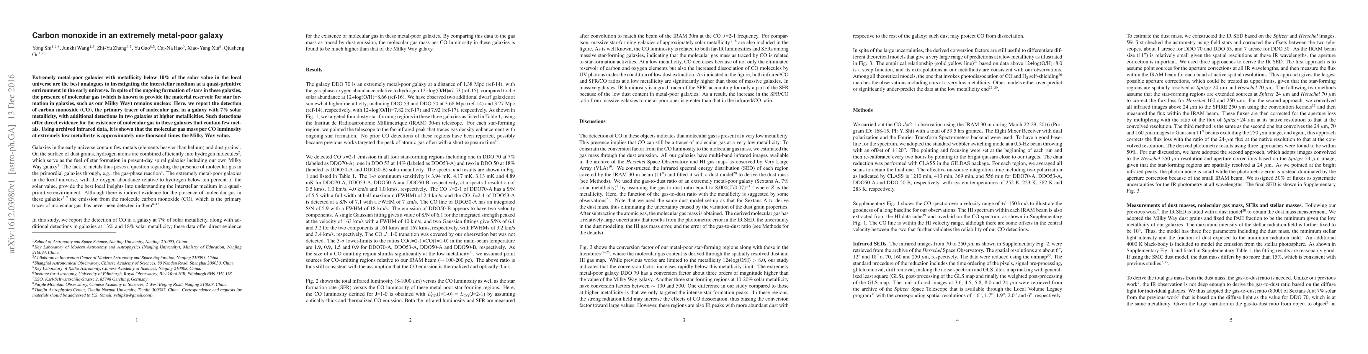 This paper reports the detection of carbon monoxide (CO) in extremely metal-poor galaxies, providing evidence for the presence of molecular gas in these metal-scarce environments. The study finds that the molecular gas mass per CO luminosity in these galaxies is significantly higher than in the Milky Way.