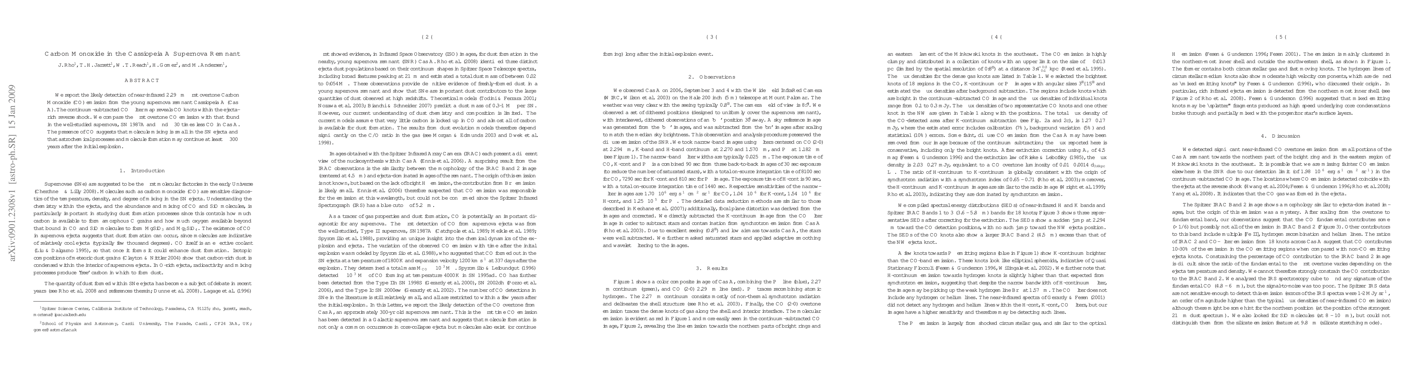 This paper reports the likely detection of Carbon Monoxide (CO) emission in the Cassiopeia A supernova remnant, indicating ongoing astrochemical processes. The CO presence suggests limited mixing in the ejecta and molecule formation continuing for at least 300 years post-explosion.