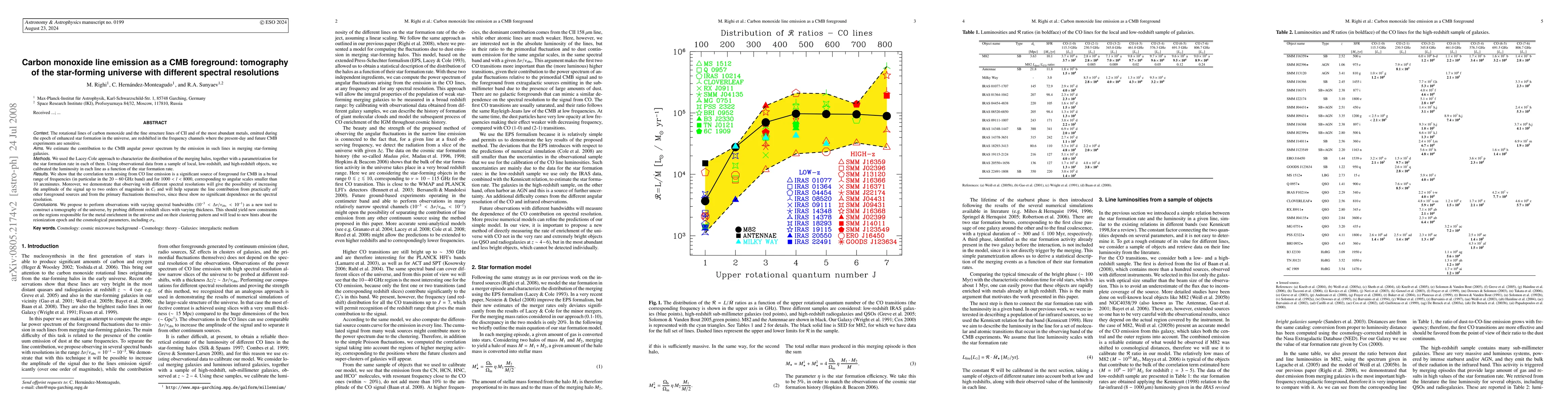 This paper investigates the impact of carbon monoxide (CO) line emission on the Cosmic Microwave Background (CMB) as a foreground, particularly from merging star-forming galaxies. It demonstrates that CO line emission significantly contributes to the CMB angular power spectrum, especially in the 20-60 GHz band, and proposes using varying spectral resolutions to enhance the signal and improve the separation from other foregrounds and primary CMB fluctuations.
