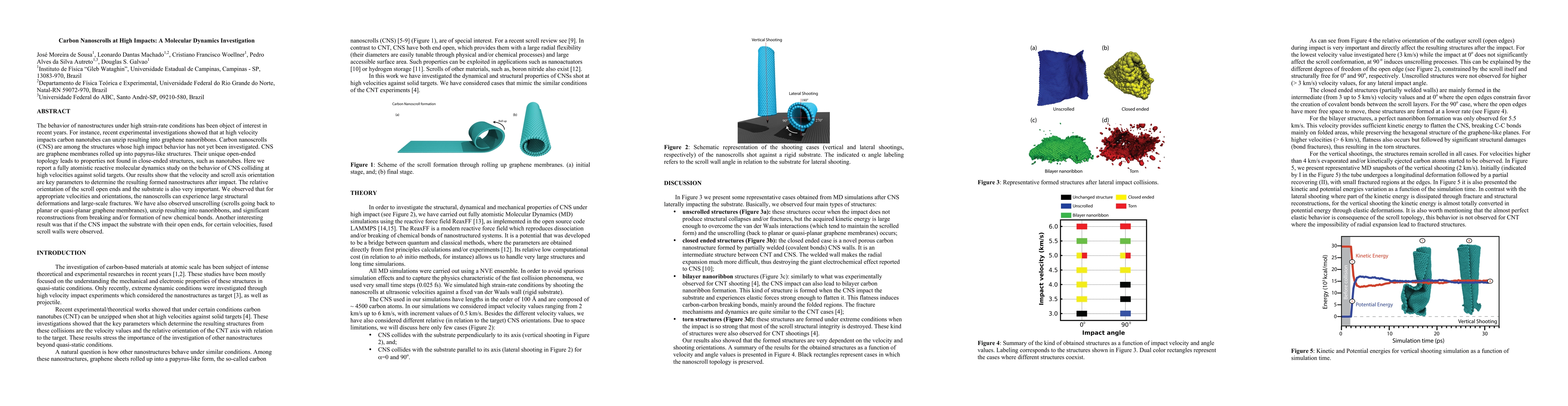 This study investigates the high-impact behavior of carbon nanoscrolls using molecular dynamics simulations, revealing that velocity and scroll axis orientation significantly influence the resulting nanostructures. The research found that under certain conditions, nanoscrolls can undergo unscrolling, unzipping into nanoribbons, and significant structural reconstructions.