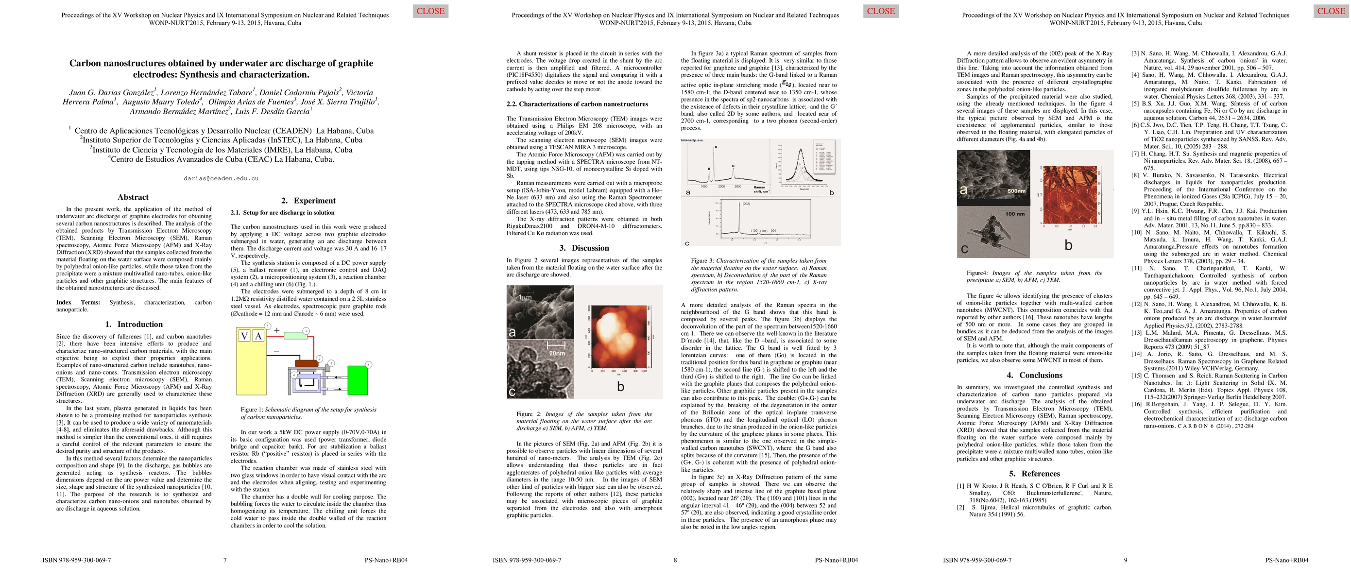 In the present work, the application of the method of underwater arc discharge of graphite electrodes for obtaining several carbon nanostructures is described. The analysis of the obtained products by Transmission Electron Microscopy (TEM), Scanning Electron Microscopy (SEM), Raman spectroscopy, Atomic Force Microscopy (AFM) and X-Ray Diffraction (XRD) showed that the samples collected from the material floating on the water surface were composed mainly by polyhedral onion-like particles, while those taken from the precipitate were a mixture multiwalled nano-tubes, onion-like particles and other graphitic structures. The main features of the obtained nanostructures are discussed.